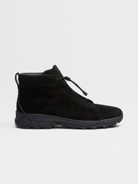 Slip on the black suede Triple Stitch™ Vetta sneakers for high-impact looks. INFO Inspired by the trails of Oasi Zegna, the black suede Triple Stitch™ Vetta shoes hybridise hiking and sporting styles. An evolution of the iconic Triple Stitch™ Luxury Leisurewear shoes, they're hallmarked with a trio of crosses that are inspired by the handmade stitches found on our jackets, then set on a Vibram® Arctic Grip™ sole — providing increased traction for outdoor pursuits. Customize these sneakers with our Made to Measure Service. For more information, please contact our Customer Care or visit your nearest stores. PRODUCT CODE LHNVB-S5809Z-NEE MATERIALS AND CARE Suede Clean with a soft cloth. Avoid contact with abrasives, water and substances containing alcohol, such as perfumes, solvents, etc. In case of contact with water, it is important to let the footwear dry completely before cleaning. Clean the rubber soles with a product specifically designed for cleaning rubber. Store in the included dust bag in a cool, dry place. FIT AND PRODUCT DETAILS • Crossing elastics • Adjustable drawstring at the ankle • Leather lining • Sanitized® insole • Black Vibram® Arctic Grip™ sole • Tonal Zegna 232 Road Brand Mark on the heel tab • Made in Italy • Comes with a shoe bag We want every pair of Triple Stitch™ sneakers to fit perfectly anytime, anywhere, anyplace. To find your perfect fit, we recommend going down a half-size compared to your usual shoe size. Please note that Zegna uses UK sizing. For further information, please contact us via our customer service channels or by visiting the nearest Zegna flagship store.
