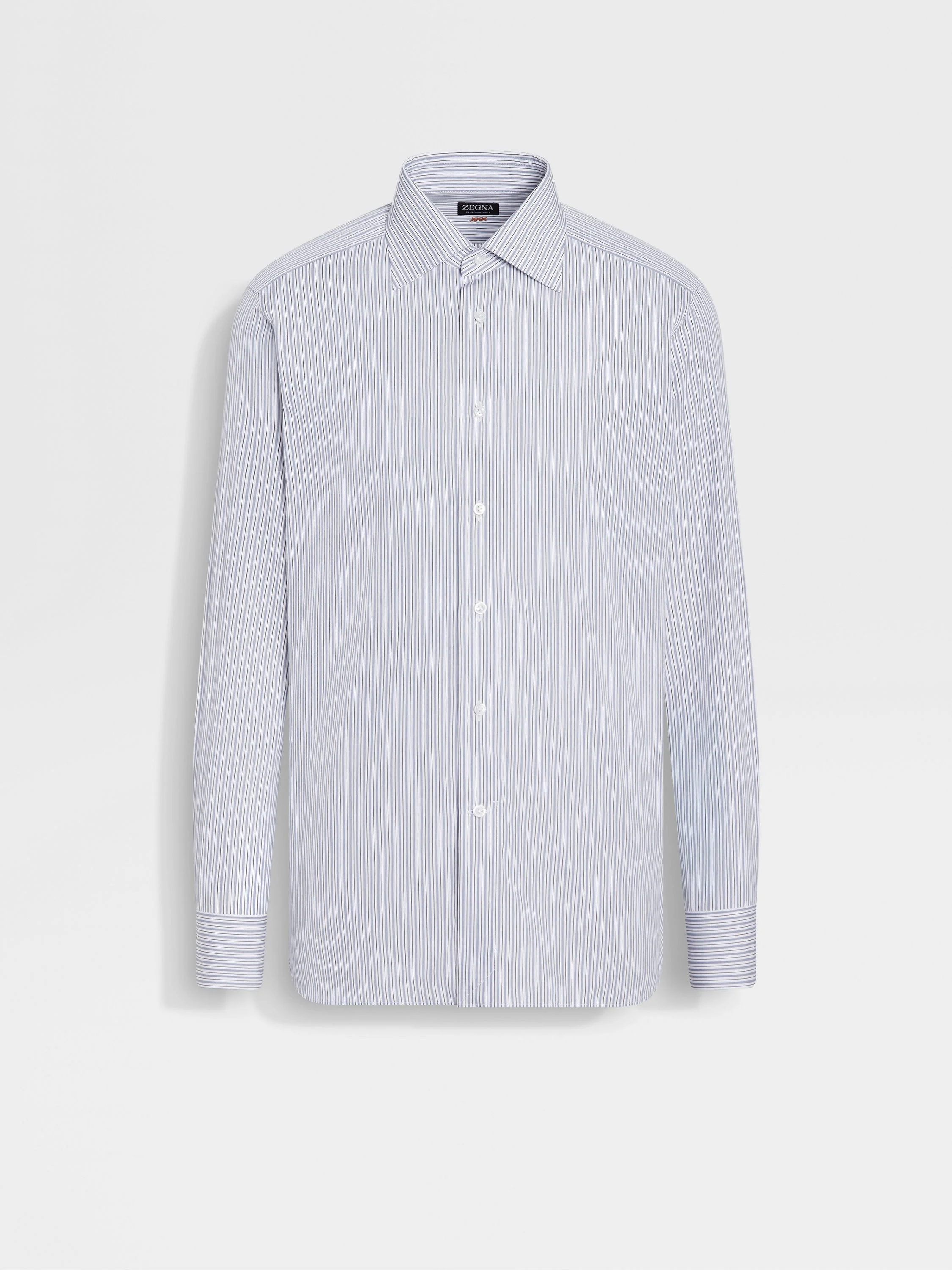 Featuring a blue and navy blue striped motif, this long-sleeve shirt is crafted from exclusive Centoventimila cotton. INFO Made from superior Centoventimila cotton, this long-sleeve shirt offers a super-smooth, lightweight feel against the skin. Designed with a striped pattern in an elegant palette of blue and navy blue hues, its smart silhouette is topped with a pointed collar. PRODUCT CODE 202054A2-9NS0PR MATERIALS AND CARE 100% Cotton Centoventimila – Italian for 120,000 – is named after its high thread count. Garments crafted from this fabric are extremely lightweight and have a soft, silk-inspired hand feel. Max washing temp 40°C. Do not bleach. Do not tumble dry. Iron at max 150°C. Professional dry cleaning in tetrachloroethene and hydrocarbons. FIT AND PRODUCT DETAILS • Regular fit • Tailoring shirt • Pointed collar • Standard cuffs • Button closure • Striped pattern • 79 cm length on size 39