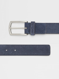 The blue suede and Foliage-colored nubuck belt features a unique, soft-touch finish. INFO Lined with Foliage-colored nubuck, the soft, blue suede belt showcases contrasting textures. Echoing Zegna's iconic Triple Stitch™ sneakers, the glazed silver belt buckle is accentuated with the collection's signature stitch marks. The XXX logo completes the contemporary accessory. PRODUCT CODE LHCAS-B014AZ-RTZ MATERIALS AND CARE Suede; Nubuck Protect from moisture and do not place near direct sources of heat. Clean with a brush designed for use with suede. Avoid contact with cosmetics, perfumes and hand lotions and sanitizers. Store in a cool, dry, well-ventilated place. Stow in the included dust bag when not in use. FIT AND PRODUCT DETAILS • Triple Stitch™ buckle • Glazed silver finish • Width: 3.2 cm / 1.2 in • Free-sized belt • Front in blue suede, lining in Foliage-colored nubuck • XXX logo • Made in Italy