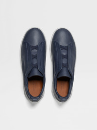 Crafted from ultra-light calf leather, the blue Triple Stitch™ SECONDSKIN sneakers offer exceptional comfort and flexibility. INFO The blue Triple Stitch™ SECONDSKIN sneakers are crafted from specially selected calf leather for even more flexibility. The brand’s signature triple-crossed elastic detail ensures an easy slip-on fit, while evoking the traditional hand-stitching of tailored jackets to symbolize and honor ZEGNA’s legacy of fine craftsmanship. The super soft, light uppers are complemented by a white rubber sole. The Triple Stitch™ SECONDSKIN shoes are the result of more than a century of generational craftsmanship, the sharing of wisdom, and dedication to innovation. Crafted from our SECONDSKIN leather, which ensures a glove-like fit, they are ideal for travelling in exceptional style and comfort. PRODUCT CODE LHOTA-S5207Z-ARE MATERIALS AND CARE Calf Leather SECONDSKIN is crafted by tanneries selected for their renowned expertise. Fine, supple and incredibly soft to the touch, it offers impeccable comfort with each wear. Clean the shoes with a soft cloth. Avoid contact with substances containing alcohol (perfumes, solvents, etc.) and, in general, any abrasive products. In the event of contact with water, it is important to allow the footwear to dry completely before cleaning. Clean the rubber sole with a product specially designed for cleaning rubber. Store the shoes in a cool, dry place in the fabric bags provided at the time of purchase. To preserve the quality of your Triple Stitch™ SECONDSKIN, we recommend using our exclusive Care Kit. FIT AND PRODUCT DETAILS • Crossed elastics • Tonal leather lining • Sanitized® removable footbed • White rubber sole • ZEGNA 232 Road Brand Mark on the heel tab • Made in Italy • Comes with a shoe bag We want every pair of Triple Stitch™ sneakers to fit perfectly anytime, anywhere, anyplace. To find your perfect fit, we recommend going down a half-size compared to your usual shoe size. Please note that ZEGNA uses UK sizing. For further information, please contact us via our customer service channels or by visiting the nearest ZEGNA flagship store.