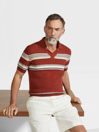 This brick red, light blue and white striped polo shirt is made from soft cotton-silk. INFO Slotting effortlessly into your everyday rotation, this refined polo shirt is jacquard-knitted from cotton and silk with a brick red, light blue and white striped pattern. A Cuban collar elevates the look with relaxed charm. PRODUCT CODE UFF85A9-C30-220 MATERIALS AND CARE 55% Cotton; 45% Mulberry Silk Do not wash. Do not bleach. Do not tumble dry. Iron at max 110°C. Professional dry cleaning in hydrocarbons, mild process. Wash and iron inside out. FIT AND PRODUCT DETAILS • 8 gauge • Cuban collar • Short sleeves • Ribbed hem and cuffs • Striped jacquard pattern