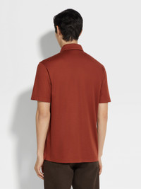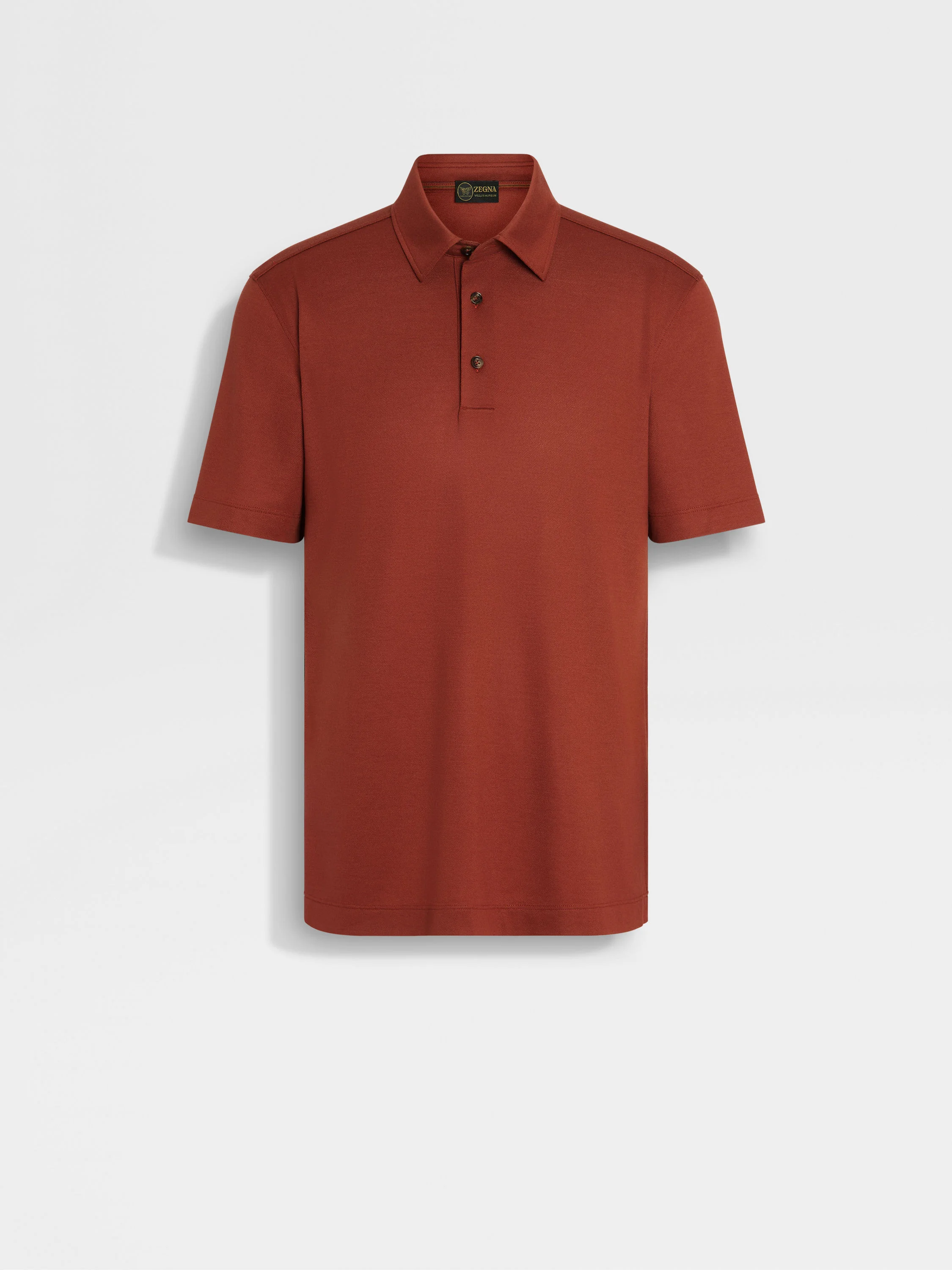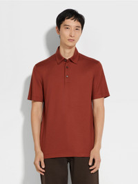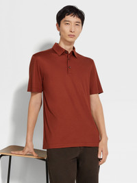 Combining fine wool with timeless design, the brick red Vellus Aureum polo shirt is a casual icon. INFO The brick red Vellus Aureum polo shirt redefines casual style with its use of fine wool. Its regular fit features short sleeves and a self-fabric polo collar for a clean, classic look. The tubular hem and cuffs provide a smooth finish, while the button closure adds a traditional touch. PRODUCT CODE UFV96A9-FV7VL9-D09 MATERIALS AND CARE 100% Wool Vellus Aureum was inspired by our founder's quest for excellence to seek the finest wool in the world. Exquisitely fine in texture and rare, we're committed to certifying Vellus Aureum fibres as 100% traceable by the end of 2025. Do not wash. Do not bleach. Do not tumble dry. Iron at max 110°C. Professional dry cleaning in hydrocarbons. Wash and iron inside out. FIT AND PRODUCT DETAILS • Short sleeves • Self fabric polo collar • Tubular hem and cuffs • Button closure • Regular fit