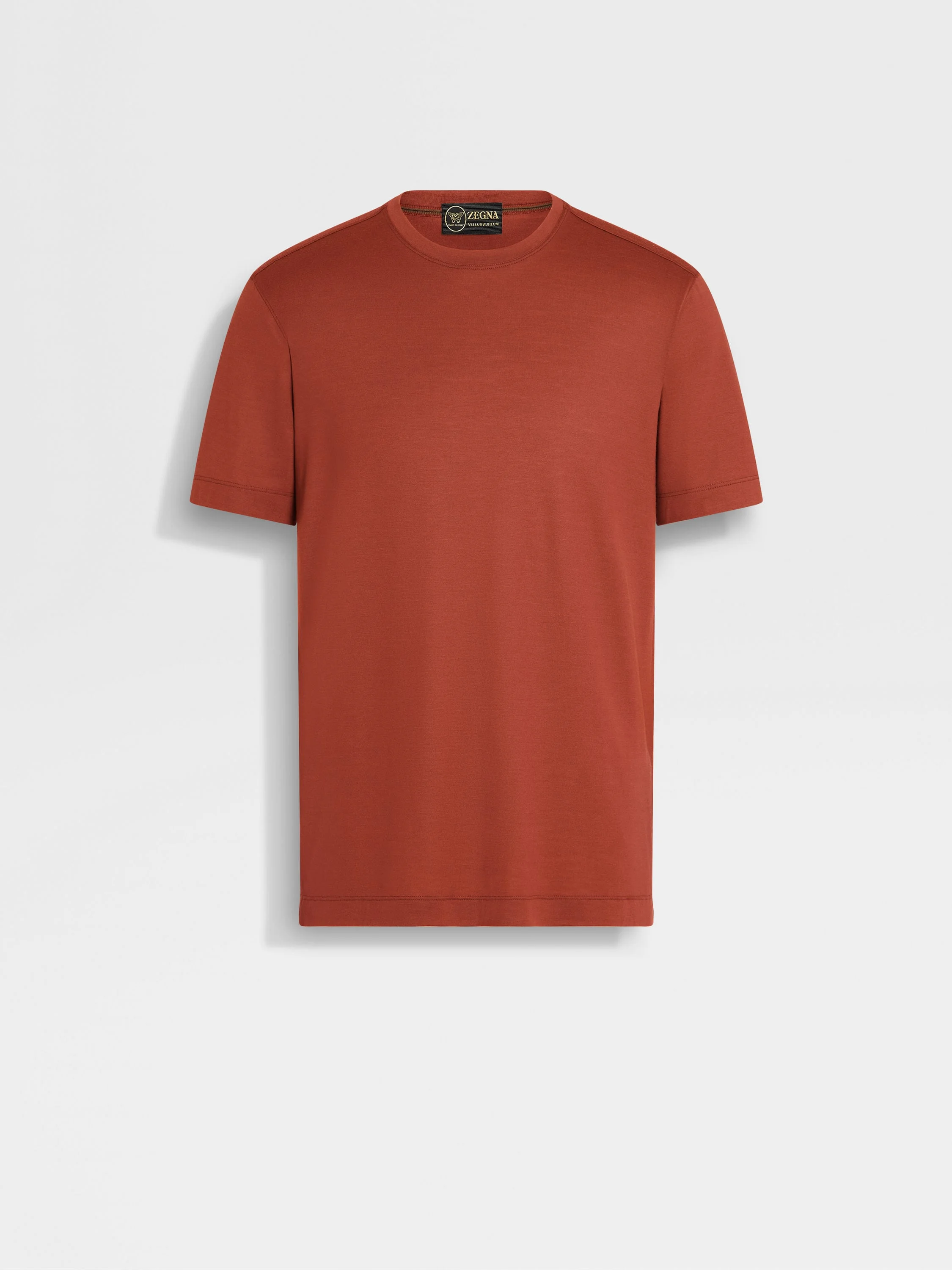 Introducing the brick red Vellus Aureum T-shirt. Exceptional softness meets understated style for everyday wear. INFO The brick red Vellus Aureum T-shirt reimagines a wardrobe staple through the lens of unique quality. Crafted from exceptionally fine wool, it offers softness and refinement. The regular fit, crewneck collar and short sleeves maintain a classic silhouette, while the tubular hem and cuffs ensure a clean finish. PRODUCT CODE UFV97A9-FV7VL8-D09 MATERIALS AND CARE 100% Wool Vellus Aureum was inspired by our founder's quest for excellence to seek the finest wool in the world. Exquisitely fine in texture and rare, we're committed to certifying Vellus Aureum fibres as 100% traceable by the end of 2025. Do not wash. Do not bleach. Do not tumble dry. Iron at max 110°C. Professional dry cleaning in hydrocarbons. FIT AND PRODUCT DETAILS • Short sleeves • Crewneck collar • Tubular hem and cuffs • Regular fit