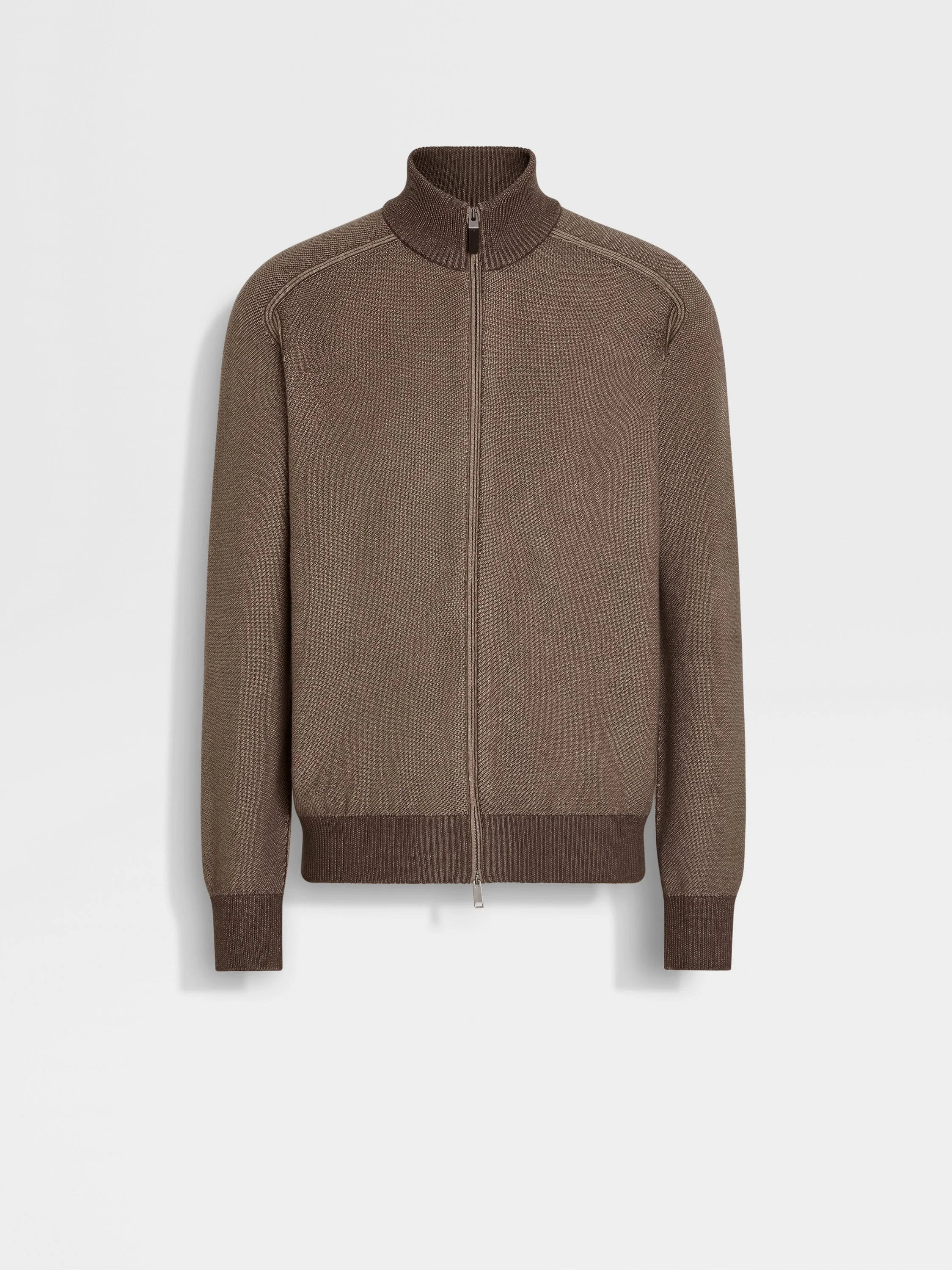 This brown and light taupe full-zip cardigan elevates a leisurewear staple in ZEGNA's luxurious Cashseta fabric. INFO The very best of cashmere and silk. This zip-through cardigan is knit with a brown and light taupe jacquard design from ZEGNA's luxurious Cashseta: an exclusive fabric that's been yarn-dyed to create a distinctive melange finish with subtle variations in each garment. Edged with snug ribbed trims. PRODUCT CODE UGJ92A2-157-155 MATERIALS AND CARE 70% Cashmere; 30% Mulberry Silk This sophisticated fabric combines the softness of cashmere with the smooth finish of fine silk. The yarns of Cashseta are dyed before the fabric is created, resulting in a melange that is unique to each garment. Do not wash. Do not bleach. Do not tumble dry. Iron at max 110°C. Professional dry cleaning in hydrocarbons, mild process. FIT AND PRODUCT DETAILS • Regular fit • 18 gauge • Ribbed stand collar • Long sleeves • Ribbed hem and cuffs • Zip closure • Bicolor jacquard knit