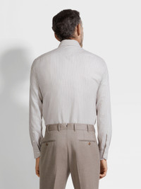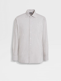 A striped pattern in brown and white brings this silk-cotton long-sleeve shirt to life. INFO A sumptuously soft silk and cotton blend expresses ZEGNA's vision of luxury tailoring with this elegant long-sleeve shirt, featuring a versatile semi-spread collar and standard cuffs. Its striped pattern stands out in a sophisticated brown and white colorway. PRODUCT CODE 202206A2-9NS0AT MATERIALS AND CARE 47% Mulberry Silk; 45% Cotton; 8% Cashmere Wash by hand. Do not bleach. Do not tumble dry. Flat drying. Iron at max 110°C. Professional dry cleaning in tetrachloroethene and hydrocarbons. FIT AND PRODUCT DETAILS • Regular fit • Tailoring shirt • Semi-spread collar • Standard cuffs • Button closure • Striped pattern • Lightweight fusing • 79 cm length on size 39