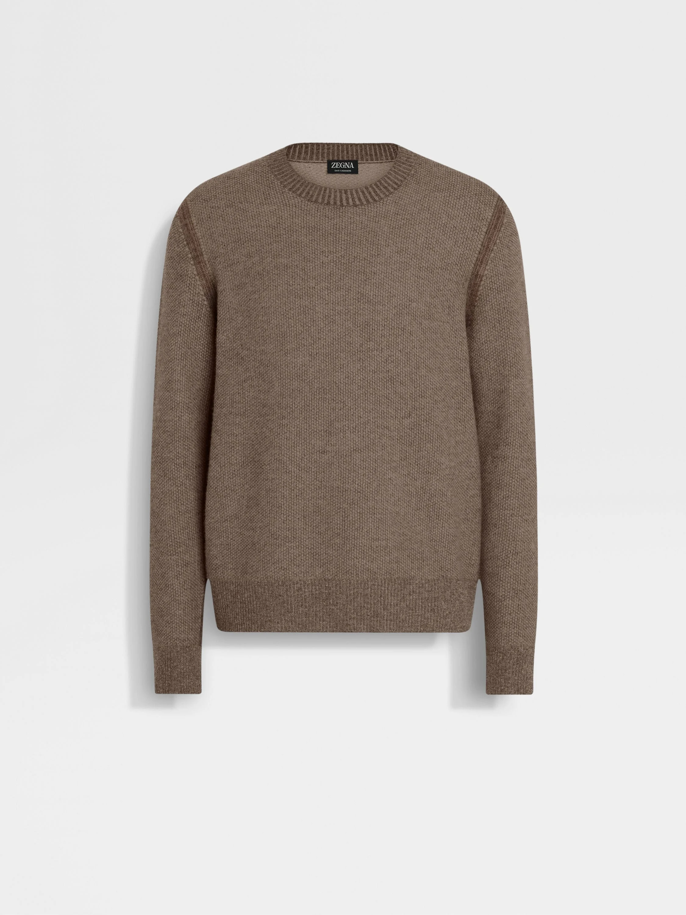 Made from ZEGNA's Oasi Cashmere, this brown crewneck is synonymous with luxury leisurewear. INFO This brown jacquard sweater elevates a classic crewneck silhouette with the beauty of ZEGNA's Oasi Cashmere. A vanise knit hem and collar add a charming touch. PRODUCT CODE UGK65A2-110-103 MATERIALS AND CARE 100% Cashmere The inspiration behind this Oasi Cashmere collection garment was born in Oasi Zegna, a 100km² natural territory and the home of our values. It's crafted from Oasi Cashmere fibres, made with 100% certified traceable fibres. The Oasi Cashmere collection follows in the footsteps of our Founder, who envisioned a vertically integrated system of producing textiles. Wash by hand. Do not bleach. Do not tumble dry. Flat drying. Iron at max 110°C. Professional dry cleaning in hydrocarbons, mild process. Wash and iron inside out. FIT AND PRODUCT DETAILS • Regular fit • 12 gauge • Ribbed crewneck collar • Long sleeves • Ribbed hem and cuffs • Vanise knit hem and collar • Jacquard pattern