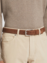 The brown suede and Foliage-colored nubuck belt features a unique, soft-touch finish. INFO Lined with Foliage-colored nubuck, the soft, brown suede belt showcases contrasting textures. Echoing Zegna's iconic Triple Stitch™ sneakers, the glazed silver belt buckle is accentuated with the collection's signature stitch marks. The XXX logo completes the contemporary accessory. PRODUCT CODE LHCAS-B014AZ-MAR MATERIALS AND CARE Suede; Nubuck Protect from moisture and do not place near direct sources of heat. Clean with a brush designed for use with suede. Avoid contact with cosmetics, perfumes and hand lotions and sanitizers. Store in a cool, dry, well-ventilated place. Stow in the included dust bag when not in use. FIT AND PRODUCT DETAILS • Triple Stitch™ buckle • Glazed silver finish • Width: 3.2 cm / 1.2 in • Free-sized belt • Front in brown suede, lining in Foliage-colored nubuck • XXX logo • Made in Italy