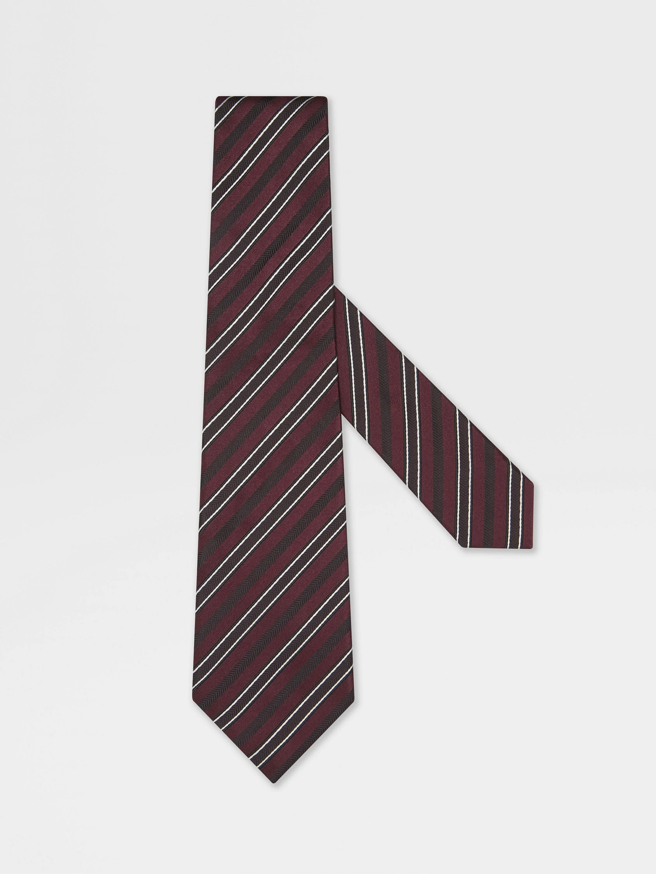 This burgundy striped tie is crafted from a refined blend of silk and cotton. INFO This jacquard tie is crafted from a sophisticated cotton and silk blend, providing a sublime backdrop for a burgundy striped pattern. A refined addition to office-to-evening looks. PRODUCT CODE Z9C15TA9-1PC-BU1 MATERIALS AND CARE Main body: 93% Mulberry Silk; 7% Cotton; Lining: 93% Mulberry Silk; 7% Cotton Do not wash. Do not bleach. Do not tumble dry. Do not iron. Professional dry cleaning in tetrachloroethene and hydrocarbons, mild process. FIT AND PRODUCT DETAILS • Blade width: 8 cm / 3.1 in • Striped jacquard pattern • Made in Italy