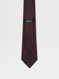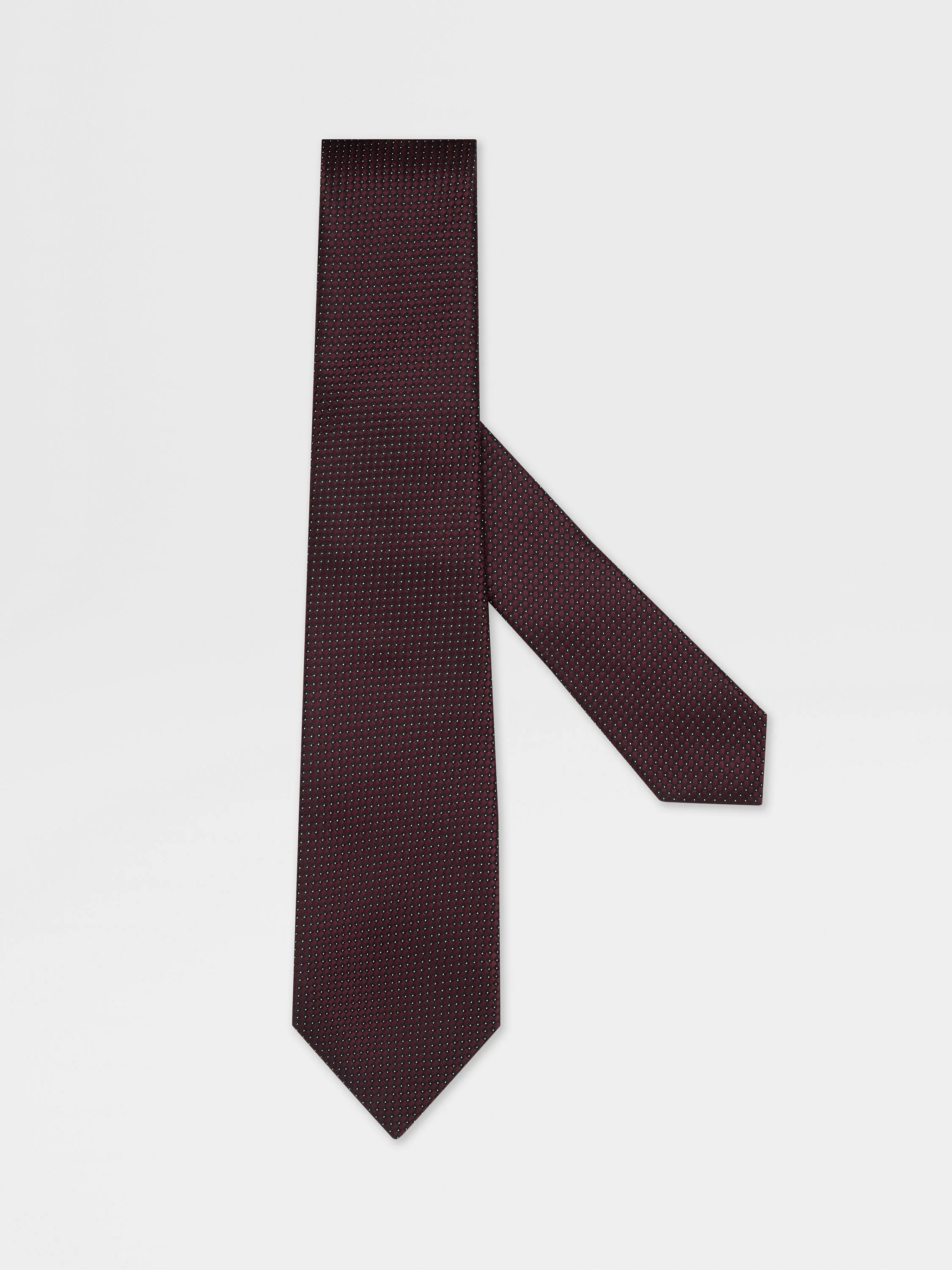 This burgundy jacquard geometric tie is crafted from pure Mulberry silk. INFO This jacquard tie is crafted from pure Mulberry silk, providing a sublime backdrop for an elegant geometric pattern. Presented in a sophisticated burgundy colorway. PRODUCT CODE Z2C40TA2-1PC-BU1 MATERIALS AND CARE Main body: 100% Mulberry Silk Lining: 100% Mulberry Silk Do not wash. Do not bleach. Do not tumble dry. Do not iron. Professional dry cleaning in tetrachloroethene and hydrocarbons, mild process. FIT AND PRODUCT DETAILS • Blade width: 8 cm / 3.1 in • Geometric jacquard pattern