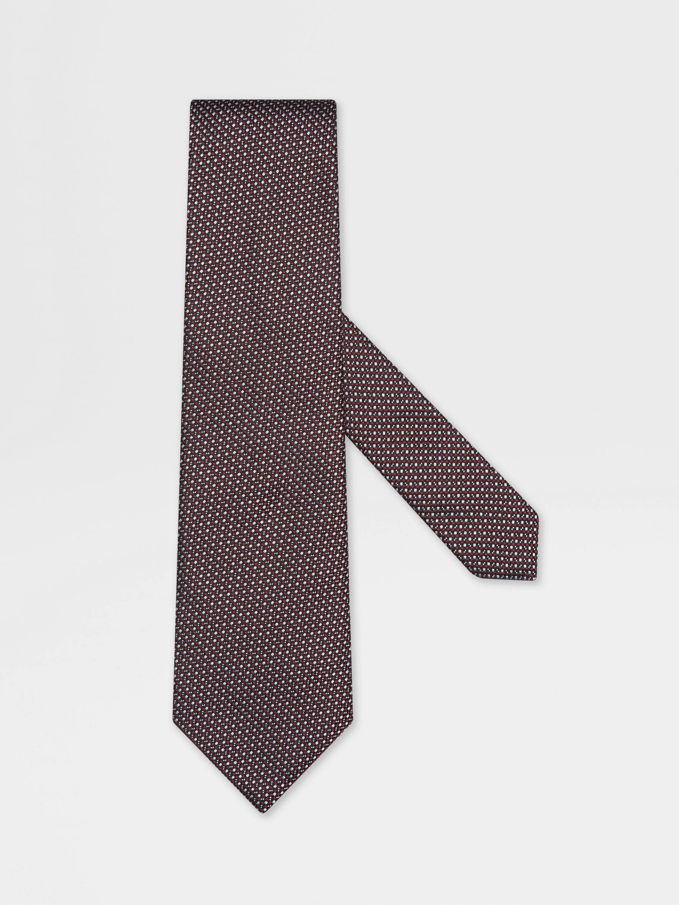 This burgundy silk tie stands out with a refined geometric pattern. INFO Crafted from pure mulberry silk, this jacquard tie is designed with a geometric pattern in a refined burgundy colorway. A charming addition to your next office-to-evening ensemble. PRODUCT CODE Z9D31TA9-1P8-BU1 MATERIALS AND CARE Main body: 100% Mulberry Silk Lining: 67% Polyester; 33% Mulberry Silk Do not wash. Do not bleach. Do not tumble dry. Do not iron. Professional dry cleaning in tetrachloroethene and hydrocarbons, mild process. FIT AND PRODUCT DETAILS • Blade width: 8 cm / 3.1 in • Geometric jacquard pattern • Made in Italy