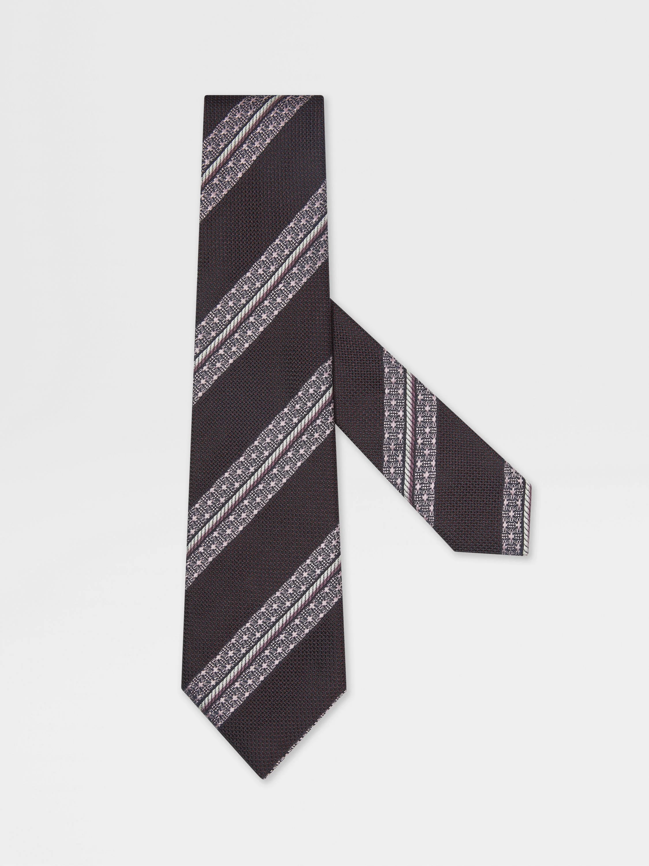 This burgundy jacquard silk tie presents a versatile striped pattern. INFO Crafted from pure Mulberry silk, this jacquard tie is designed with a timeless striped pattern in a burgundy colorway. An effortlessly elegant addition to your next evening ensemble. PRODUCT CODE Z2C01TA2-1PC-BU1 MATERIALS AND CARE Main body: 100% Mulberry Silk Lining: 100% Mulberry Silk Do not wash. Do not bleach. Do not tumble dry. Do not iron. Professional dry cleaning in tetrachloroethene and hydrocarbons, mild process. FIT AND PRODUCT DETAILS • Blade width: 8 cm / 3.1 in • Striped jacquard pattern