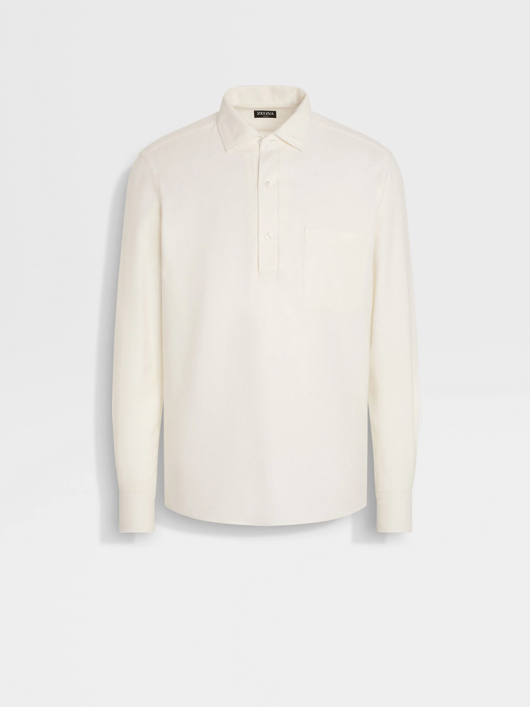 This long-sleeve white melange Cashco shirt brings together the very best of cotton and cashmere. INFO ZEGNA's signature blend of cotton and cashmere elevates a timeless silhouette to luxury status. Styled with a rounded hem and long sleeves, this Cashco shirt is presented in a white melange hue for endless versatility. Finished with a pocket on the chest. PRODUCT CODE UGX34A2-SRF13-N01 MATERIALS AND CARE 93% Cotton; 7% Cashmere This garment is crafted from a luxurious blend of cashmere and cotton for exceptional softness and breathability. Wash by hand. Do not bleach. Do not tumble dry. Flat drying. Iron at max 110°C. Professional dry cleaning in tetrachloroethene and hydrocarbons. FIT AND PRODUCT DETAILS • Regular fit • One-piece shirt collar • Shirt cuffs • Button closure • Rounded hem • Chest patch pocket • Side vents • 77 cm length on size 39