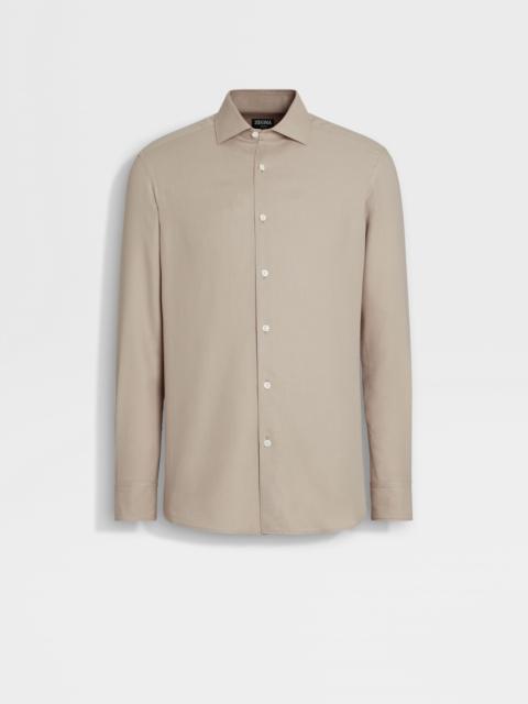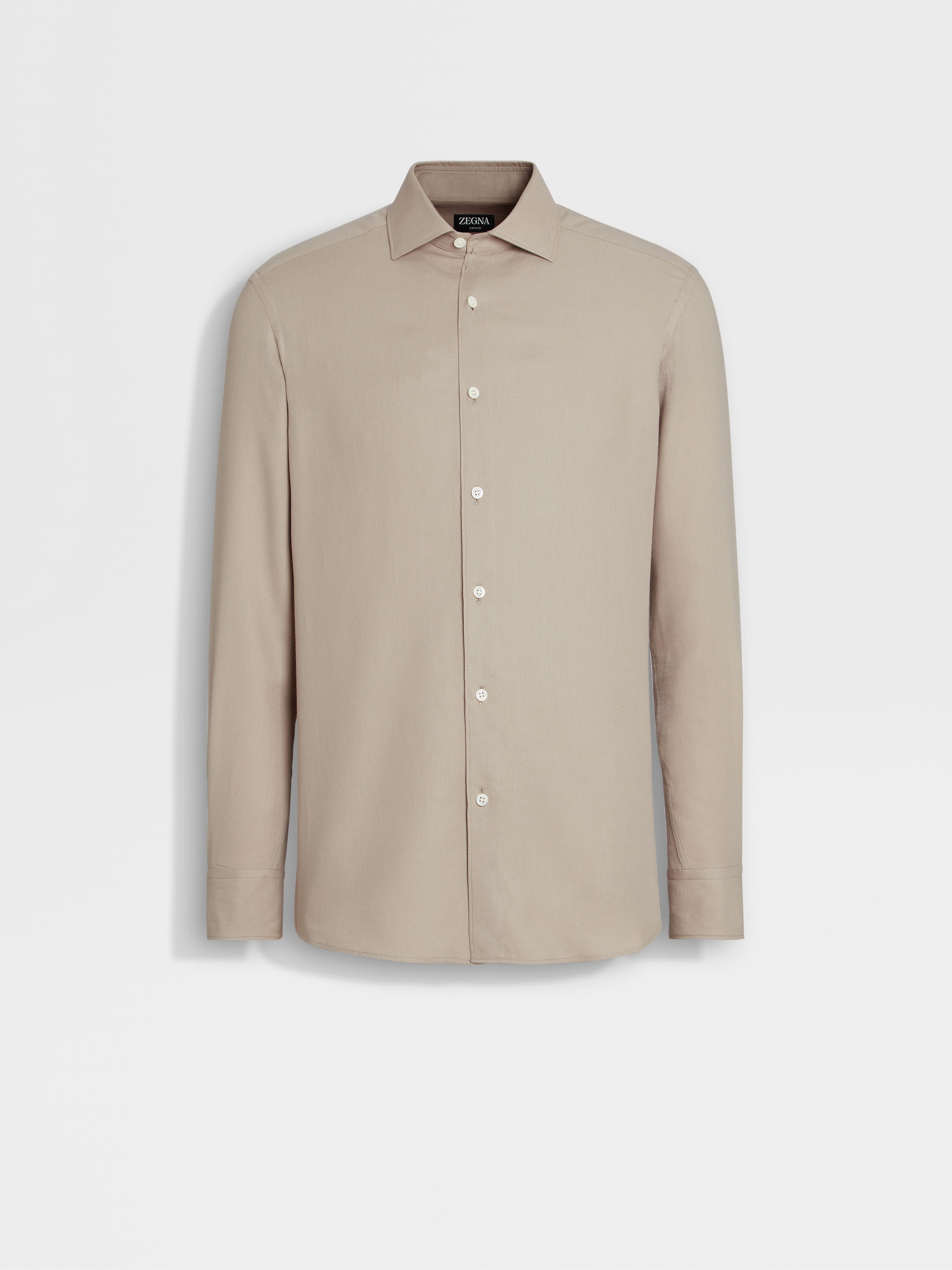 A refined blend of cotton and cashmere gives the light taupe Cashco shirt its distinctive texture. INFO The light taupe Cashco shirt is made from one of Zegna's lightest yarns. Perfect for everyday wear, this elegant, long-sleeve shirt is styled with a semi-spread collar and standard cuffs. PRODUCT CODE UEX44A8-SRF5-N92 MATERIALS AND CARE 85% Cotton; 15% Cashmere This garment is crafted from a luxurious blend of cashmere and cotton for exceptional softness and breathability. Wash by hand. Do not bleach. Do not tumble dry. Iron at max 110°C. Professional dry cleaning in tetrachloroethene and hydrocarbons. FIT AND PRODUCT DETAILS • Regular fit • Semi-spread collar • Standard cuffs • Button closure • Rounded hem • 79 cm length on size 39