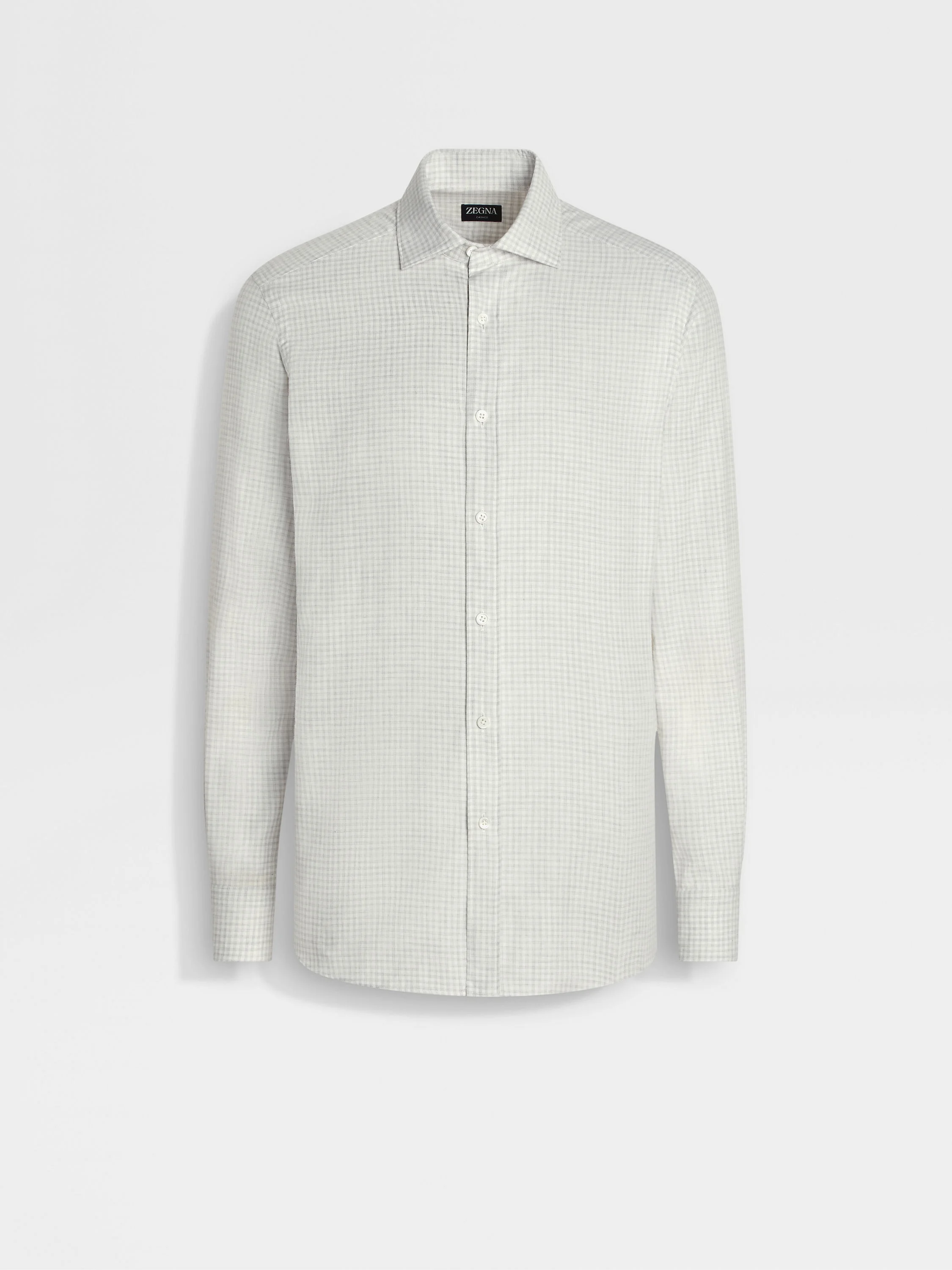 This Cashco long-sleeve shirt exudes dynamic elegance with its light grey and white checked pattern. INFO ZEGNA's signature blend of cotton and cashmere breathes new life into a familiar long-sleeve silhouette, imbuing this light grey and white checked shirt with elevated levels of comfort and style. Designed with a versatile semi-spread collar and rounded hem. PRODUCT CODE UGX45A2-SRF5-742 MATERIALS AND CARE 85% Cotton; 15% Cashmere This garment is crafted from a luxurious blend of cashmere and cotton for exceptional softness and breathability. Wash by hand. Do not bleach. Do not tumble dry. Iron at max 110°C. Professional dry cleaning in tetrachloroethene and hydrocarbons. FIT AND PRODUCT DETAILS • Regular fit • Semi-spread collar • Standard cuffs • Button closure • Rounded hem • Checked pattern • 79 cm length on size 39