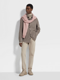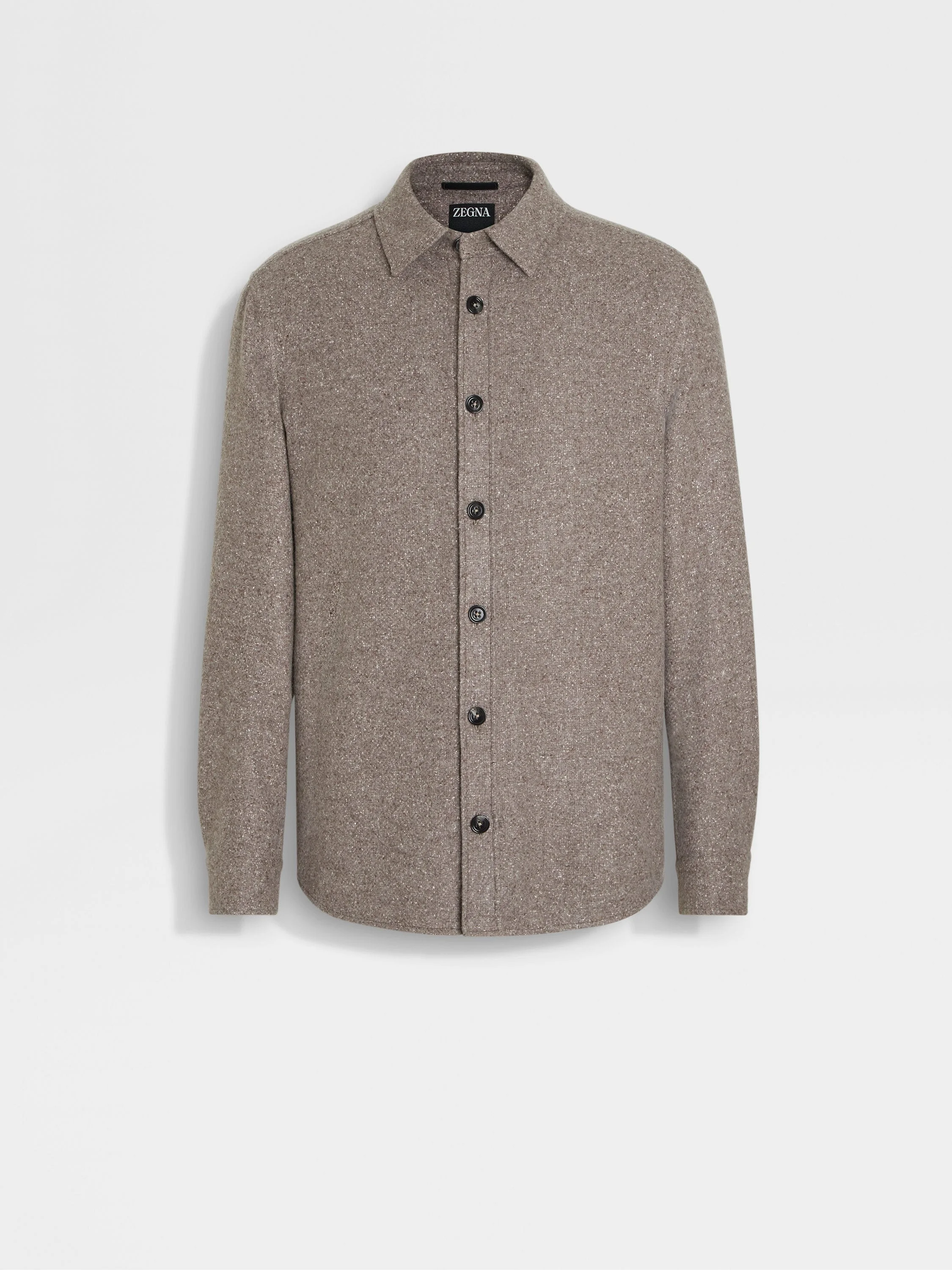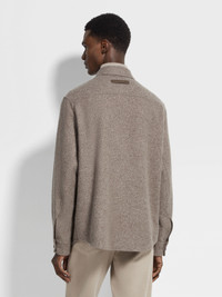 Embrace effortless elegance in this brown cashmere-silk overshirt. INFO Nothing says elevated leisurewear like a versatile silhouette in a luxurious blend of cashmere and silk. This overshirt boasts a refined Natte Donegal motif in a charming brown colorway. Leather details elevate its relaxed lines with a sleek touch. PRODUCT CODE UGV10A2-SOT48-018 MATERIALS AND CARE Main body: 59% Cashmere; 41% Mulberry Silk Leather details: Calfskin Do not wash. Do not bleach. Do not tumble dry. Do not iron. Professional dry cleaning in tetrachloroethene and hydrocarbons, mild process. FIT AND PRODUCT DETAILS • Regular fit • Shirt collar • Shirt cuffs • Button closure • Front placket • Leather details • Natte Donegal pattern • 76 cm length on size 39