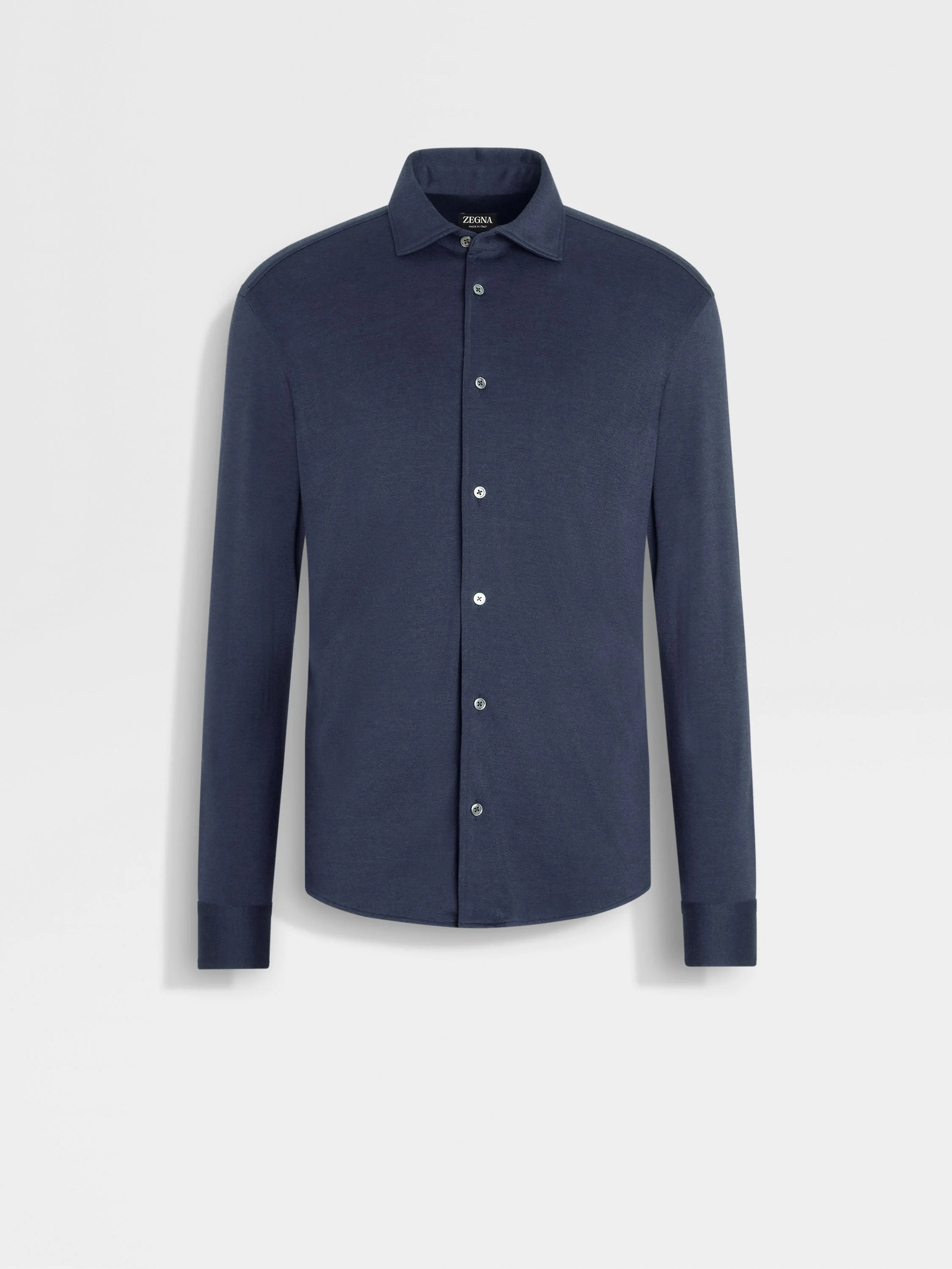 The best of cashmere and silk elevate this ink blue long-sleeved shirt to luxury status. INFO The exquisitely soft texture of cashmere-silk reimagines a menswear classic through the lens of quiet luxury. Presented in a charming ink blue colorway, this long-sleeved shirt features a timelessly elegant collar, cuffs and button closure. PRODUCT CODE UGX24A2-SJF11-B06 MATERIALS AND CARE 70% Cashmere; 30% Mulberry Silk Do not wash. Do not bleach. Do not tumble dry. Iron at max 110°C. Professional dry cleaning in tetrachloroethene and hydrocarbons, mild process. FIT AND PRODUCT DETAILS • Regular fit • Shirt collar • Shirt cuffs • Button closure • 76 cm length on size 39