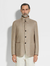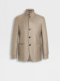 Our Il Conte chore jacket is a formal masterpiece, presented in a light taupe cashmere-silk-linen blend. INFO A refined blend of cashmere, silk and linen gives this light taupe take on Zegna's iconic Il Conte chore jacket a sumptuous, luxurious feel. Styled with a distinctive standing collar, full button closure and the signature Zegna 232 Road Brand Mark on the back. Il Conte jacket pays homage to our Founder, Ermenegildo Zegna. He was bestowed the noble title of Count of Monte Rubello for the legacy he created as an entrepreneur, philanthropist and businessman. PRODUCT CODE 960C61A9-1VHKQ0 MATERIALS AND CARE 63% Cashmere; 23% Mulberry Silk; 14% Linen Leather details: Calfskin Do not wash. Do not bleach. Do not tumble dry. Professional dry cleaning in tetrachloroethene and hydrocarbons, mild process. FIT AND PRODUCT DETAILS • Regular fit • Tailoring chore jacket • Single vent • Standing collar • Button closure • Natte texture • Leather Zegna 232 Road Brand Mark on the back • Patch pockets • Leather mini pocket in the right pocket • Half lined • Deconstructed, fused • 73 cm length on size 48