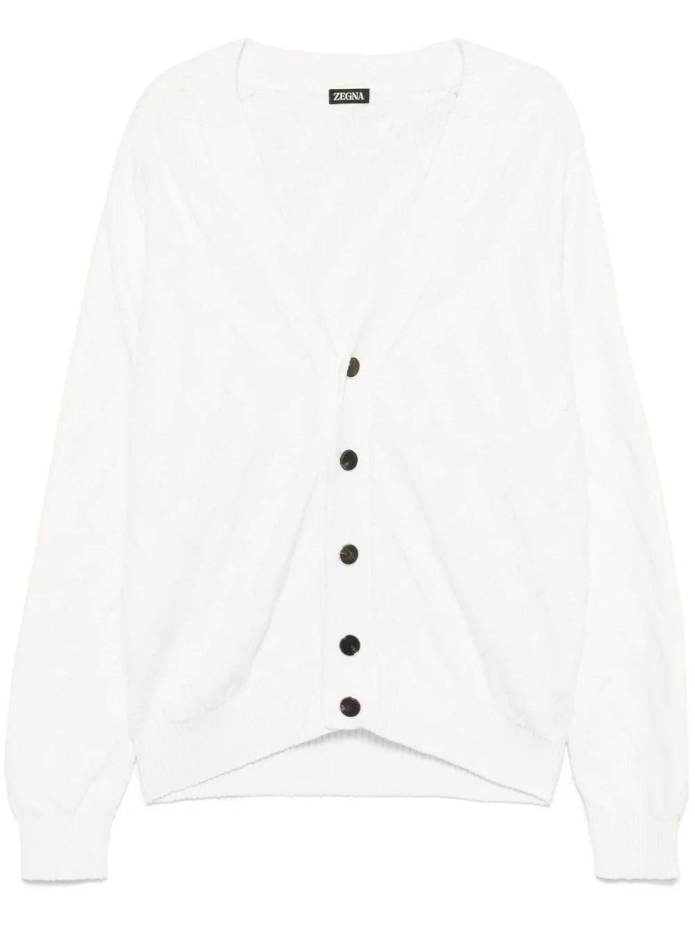 chunky-knit cardigan Highlights - White - Front button fastening - V-neck - Long sleeves - Ribbed-knit edge Made in Italy Composition Cotton 100% SIZE & FIT Model measurements Height 6 ft 1 in(1.86 m) Bust/Chest 36.61 in(93 cm) Hips 37 in(94 cm) Waist 28.74 in(73 cm) FittingInformation Designed for a regular fit, offering a comfortable loose fit throughout the body Made with a midweight knit, this piece offers some stretch