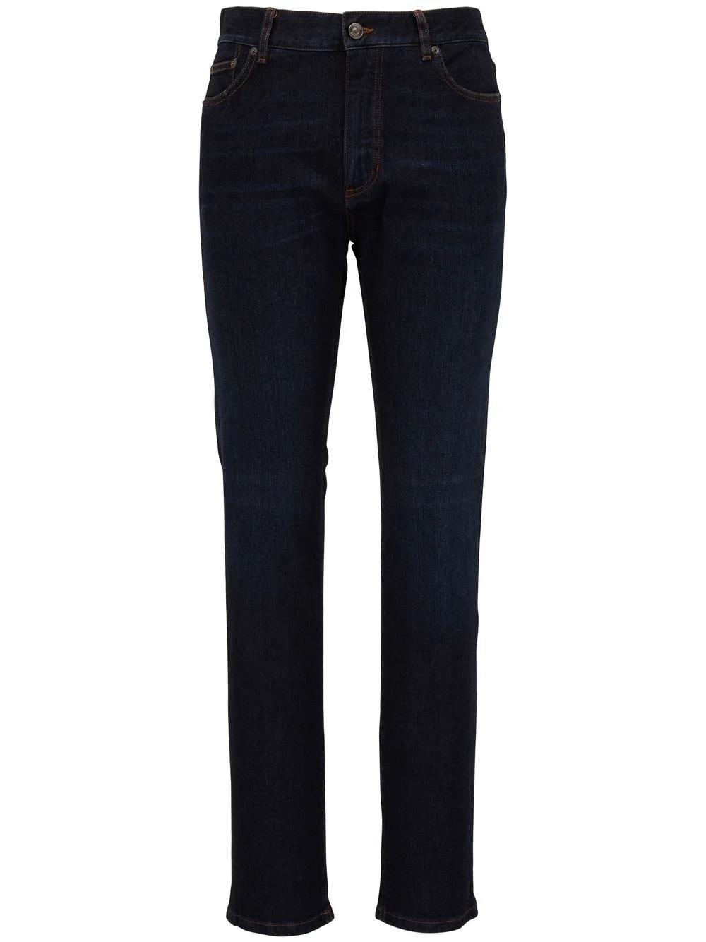 City slim-fit jeans blue rinse wash stretch-cotton contrast stitching whiskering effect at the thighs logo patch to the rear mid-rise belt loops front button and zip fastening classic five pockets slim cut Made in United States Composition Cotton 99%, Spandex/Elastane 1%