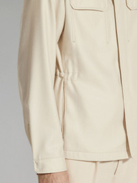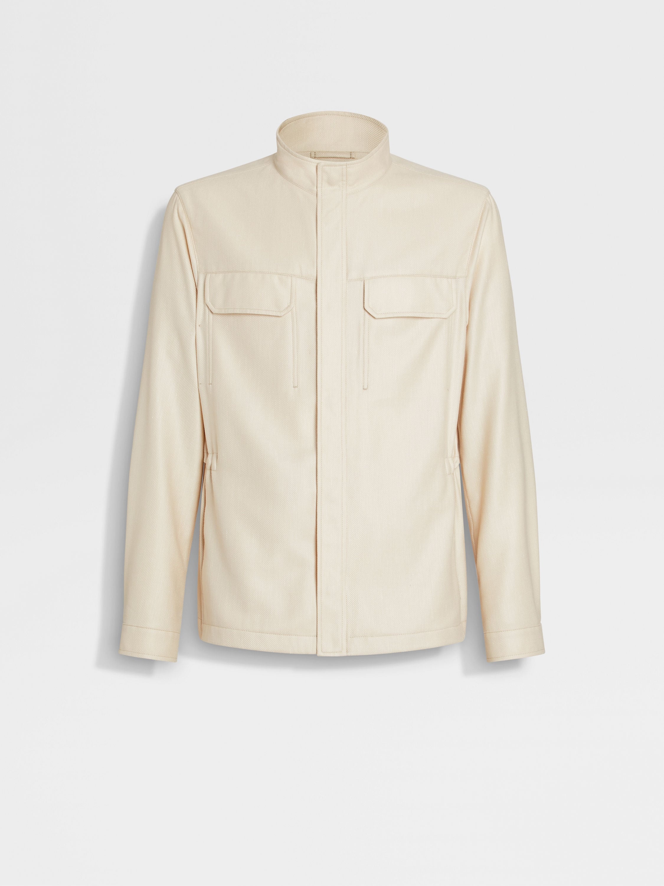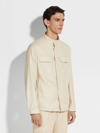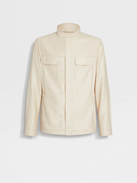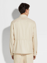 The white cashmere, silk and linen blouson is a sleek choice of casual outerwear. INFO A simple silhouette puts the emphasis on the white cashmere, silk and linen blouson's refined materials. This luxuriously soft jacket is styled with a sleek, stand collar and flap pockets on the chest. Leather details along the placket, cuffs and pockets add a final accent. PRODUCT CODE UET43A8-E240-N01 MATERIALS AND CARE Main body: 64% Cashmere; 23% Mulberry Silk; 13% Linen Leather details: Calfskin Do not wash. Do not bleach. Do not tumble dry. Iron at max 110°C. Professional dry cleaning in hydrocarbons, mild process. Professional leather clean only. Protect leather details before washing. FIT AND PRODUCT DETAILS • Regular fit • Stand collar • Zip and snap button closure • Open hem • Adjustable cuffs • Adjustable drawstring at the waist • Leather details on placket, cuffs and pockets • Chest flap pockets • Side slanted pockets • 73 cm length on size 48