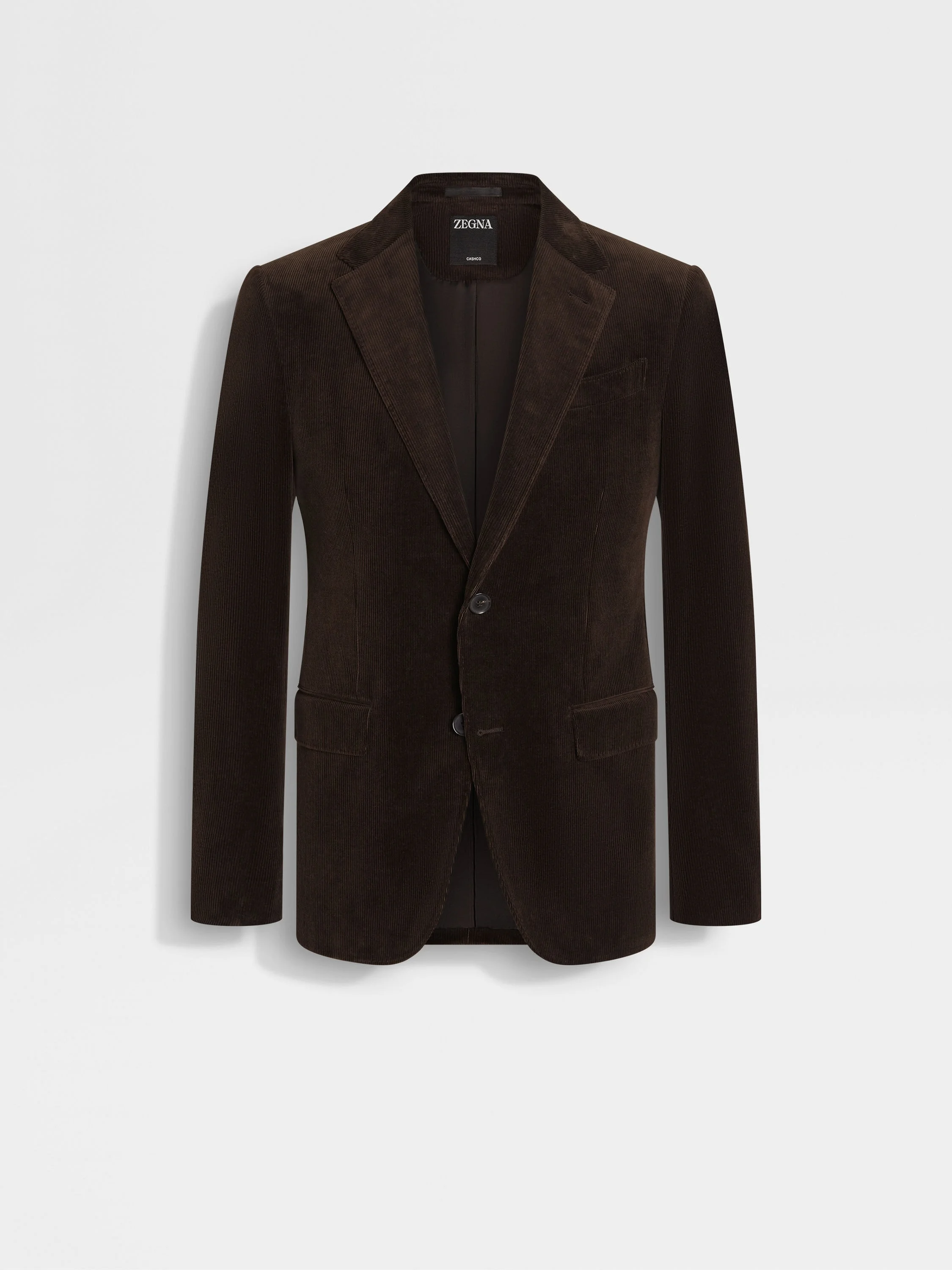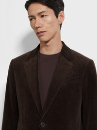 This dark brown Cashco corduroy jacket elevates a tailored silhouette in ZEGNA's luxurious cotton-cashmere blend. INFO This dark brown Cashco corduroy jacket is made from a compact, lustrous blend of natural cashmere and cotton, infused with a hint of stretch for comfort. Dapper notch lapels and flap pockets bring timeless charm to its elegant silhouette. PRODUCT CODE 270533A2-12FT20 MATERIALS AND CARE 91% Cotton; 8% Cashmere; 1% Elastane This garment is crafted from a luxurious blend of cashmere and cotton for exceptional softness and breathability. Do not wash. Do not bleach. Do not tumble dry. Iron at max 110°C. Professional dry cleaning in tetrachloroethene and hydrocarbons, mild process. FIT AND PRODUCT DETAILS • Regular fit • Tailoring jacket • Double vents • Notch lapels • Corduroy • Button closure • Flap pockets • Deconstructed, canvas • Lined • 73,5 cm length on size 48