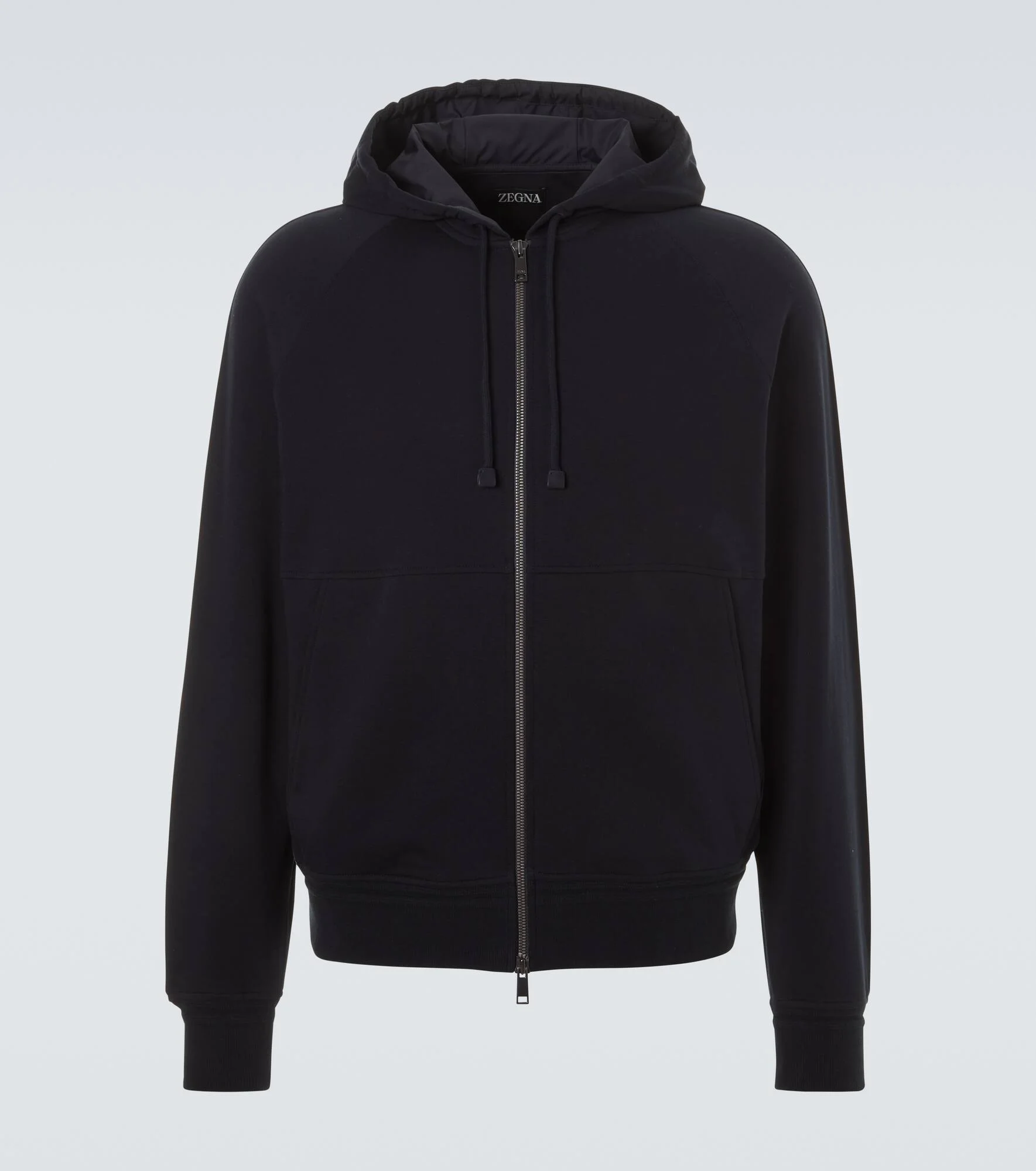 Established with the aim to create the world’s finest fabrics, Zegna is now the go-to brand for luxurious and innovative menswear. This hoodie is crafted from a soft cotton-blend into a classic silhouette. Product Details - Material: 95% cotton, 5% elastane - Care instructions: hand wash - Made in Turkey - Color: blue - Designer color name: Navy Blue - Lining: 100% polyester - Trim: 85% cotton, 14% polyamide, 1% elastane - Contains non-textile parts of animal origin - Closure: two-way zipped front - Drawstring hood - Pockets: slant pockets - Cuff: ribbed - Hem: ribbed - Item number: P01137491 Size & Fit - True to size - Straight fit - Slightly stretchy fabric - Falls to the hip - The model in the picture is 185cm-6'1" and wearing a size IT 50