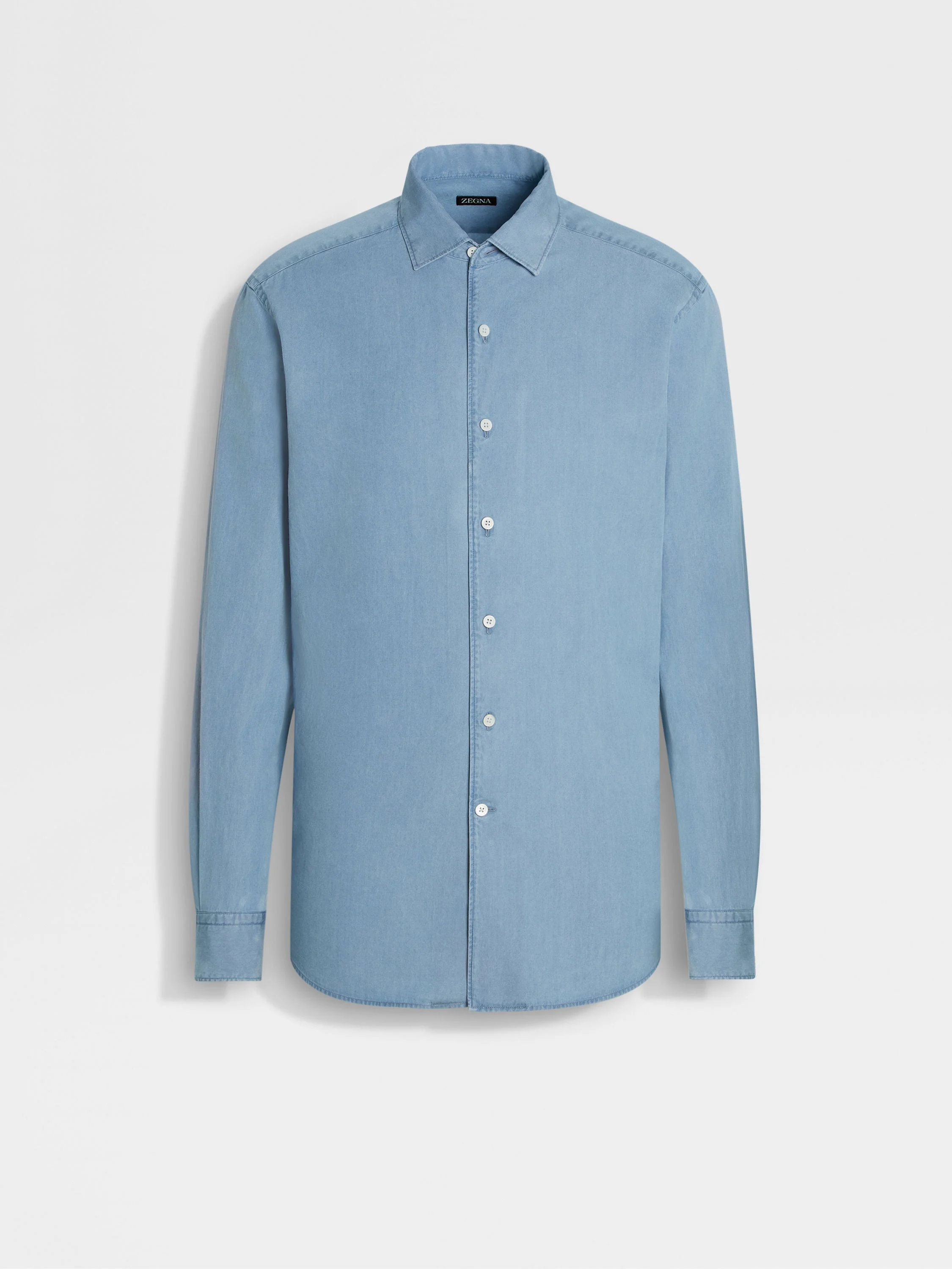 Pure cotton in elegant light blue: this long-sleeve shirt is a smart essential. INFO A tale of simple elegance: this long-sleeve shirt is crafted from crisp cotton in a charming light blue colorway, enriched with a bleached finish for authentic charm. Styled with standard cuffs and side gussets. PRODUCT CODE UGX25A2-SRO1-004 MATERIALS AND CARE 100% Cotton Max washing temp 30°C. Do not bleach. Do not tumble dry. Line drying in the shade. Iron at max 110°C. Professional dry cleaning in tetrachloroethene and hydrocarbons. FIT AND PRODUCT DETAILS • Regular fit • One-piece collar • Standard cuffs • Button closure • Bleached • Side gussets • 79 cm length on size 39
