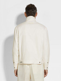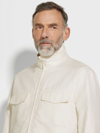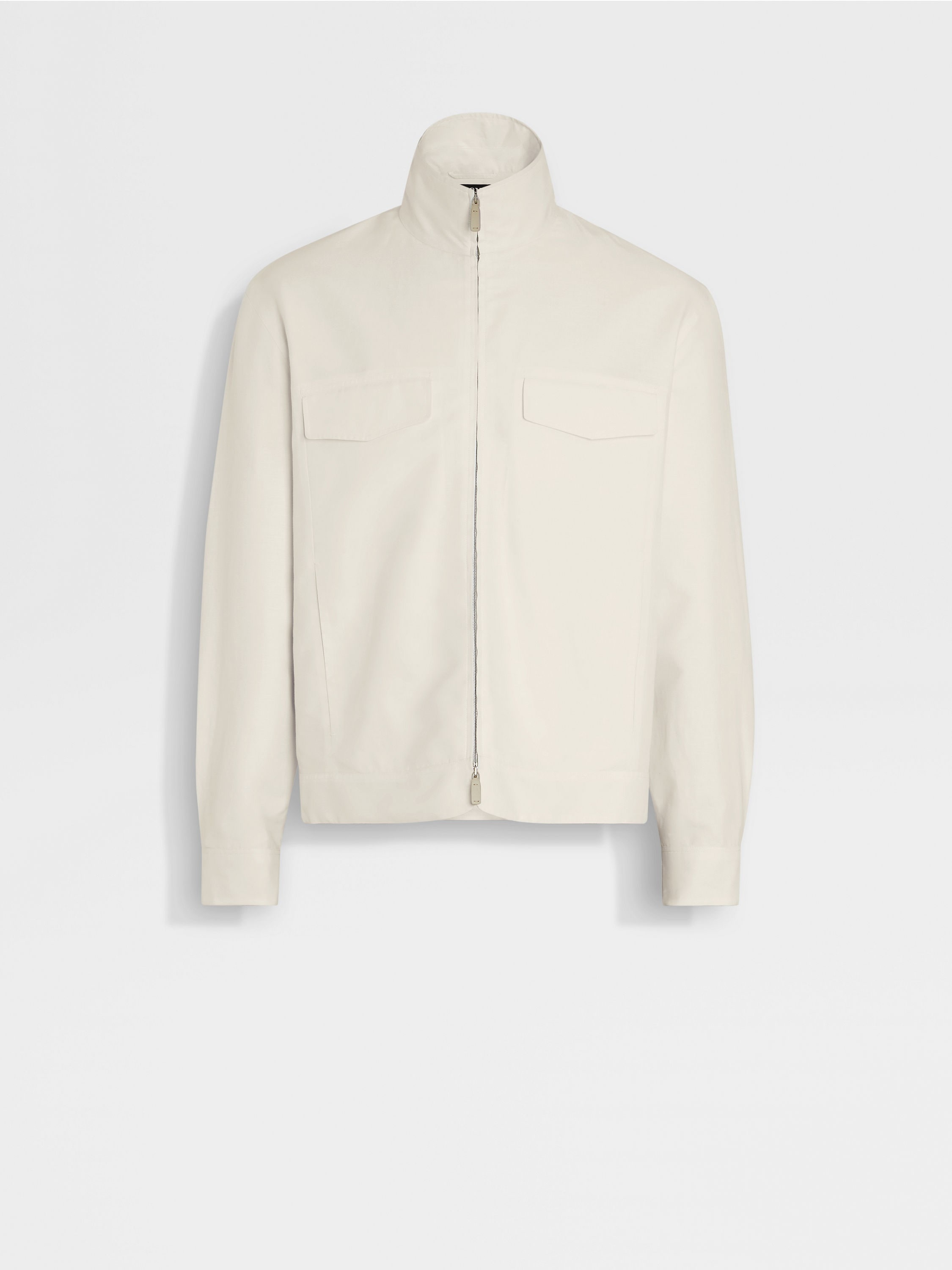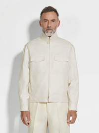 Superlight cotton-linen-silk Crossover fabric elevates this white overshirt to luxury leisurewear status. INFO This white overshirt is crafted from Zegna's exclusive Crossover fabric, spun from an exquisite blend of cotton, linen and silk. Perfect for layering, its casual silhouette is styled with a zip-up collar, chest pockets and an adjustable hem. PRODUCT CODE UFV33A9-SOT47-101 MATERIALS AND CARE Main body: 60% Cotton; 25% Linen; 15% Mulberry Silk Leather details: Calfskin Do not wash. Do not bleach. Do not tumble dry. Iron at max 110° C. Professional dry cleaning in tetrachloroethene and hydrocarbons, mild process. FIT AND PRODUCT DETAILS • Regular fit • Zip-up collar • Zip closure • Straight adjustable hem • Shirt cuffs • Stand inseam side pockets • Chest flap pockets • Leather details • 66 cm length on size 48