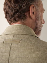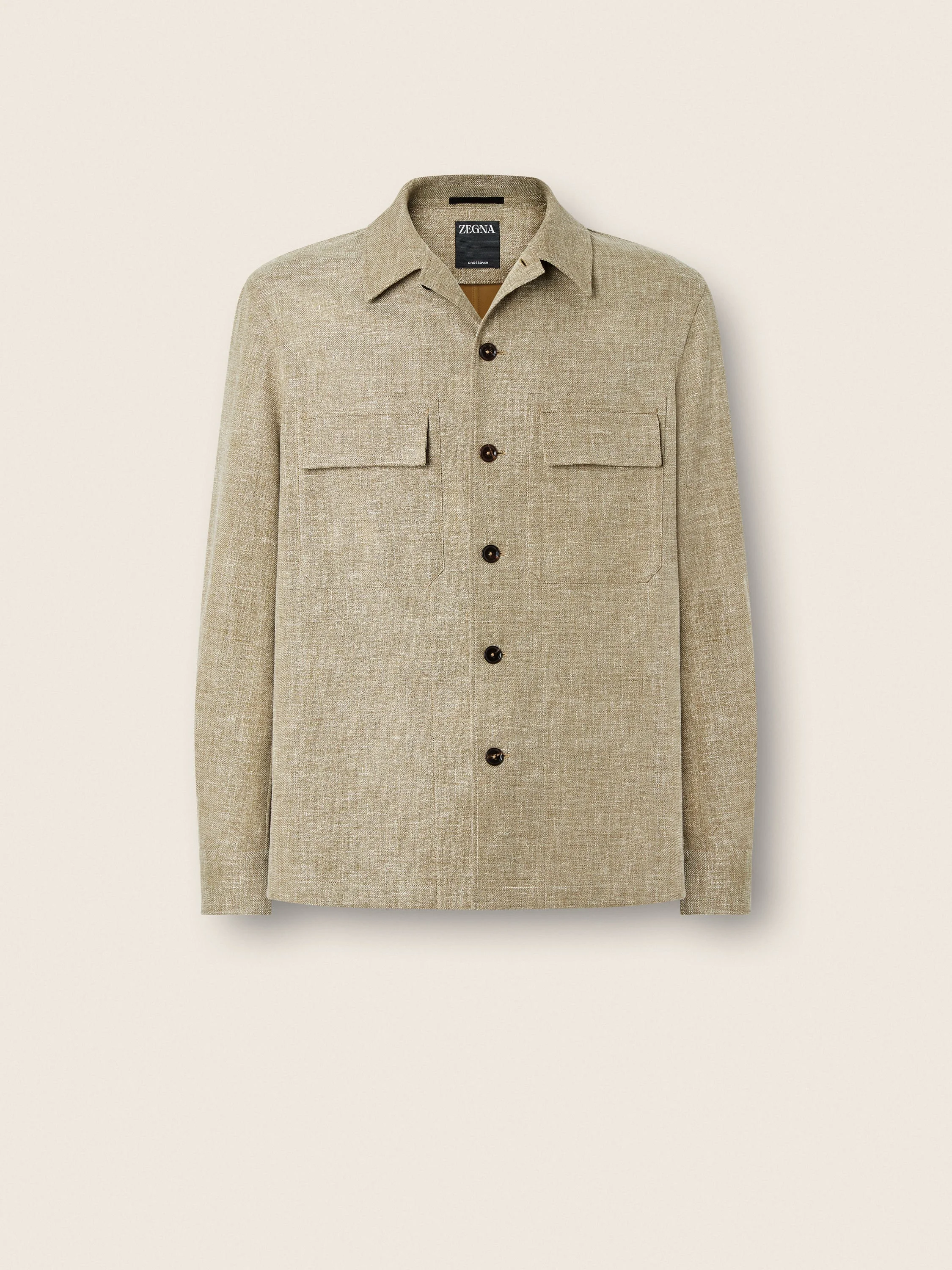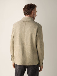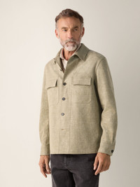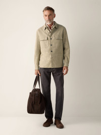This olive green Crossover linen-wool-silk overshirt features patches on the elbows for a charming touch. INFO Crafted from impeccably lightweight Crossover fabric, spun from linen, wool and silk with just the right amount of stretch, this olive green overshirt is a masterclass in effortless layering. Styled with a straight hem, flap pockets and double vents. PRODUCT CODE UHV22A3-SOT6B-V04 MATERIALS AND CARE Main body: 46% Linen; 31% Wool; 19% Mulberry Silk; 3% Polyamide; 1% Elastane Leather details: Calfskin Do not wash. Do not bleach. Do not tumble dry. Iron at max 110°C. Professional dry cleaning in tetrachloroethene and hydrocarbons, mild process. FIT AND PRODUCT DETAILS • Regular fit • Shirt collar • Shirt cuffs • Button closure • Straight hem • Flap pockets on chest • Leather details • Elbow patches • Double vents • 73 cm length on size 39