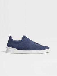 The utility blue suede Triple Stitch™ low top sneakers have soft-touch uppers. INFO The utility blue suede Triple Stitch™ low top sneakers offer a luxurious take on casual footwear. The sneakers slip on easily thanks to the collection's iconic, triple-crossed elastics, which evoke the hand-stitching on our tailored jackets. A white rubber sole adds a pop of contrast. Customize these sneakers with our Made to Measure Service. For more information, please contact our Customer Care or visit your nearest stores. PRODUCT CODE LHSOY-S4667Z-RTZ MATERIALS AND CARE Suede Clean with a soft cloth. Avoid contact with abrasives, water and substances containing alcohol, such as perfumes, solvents, etc. In case of contact with water, it is important to let the footwear dry completely before cleaning. Clean the rubber soles with a product specifically designed for cleaning rubber. Store in the included dust bag in a cool, dry place. FIT AND PRODUCT DETAILS • Crossing elastics • Leather lining • Sanitized® insole • White rubber sole • Tonal Zegna 232 Road Brand Mark on the heel tab • Made in Italy • Comes with a shoe bag We want every pair of Triple Stitch™ sneakers to fit perfectly anytime, anywhere, anyplace. To find your perfect fit, we recommend going down a half-size compared to your usual shoe size. Please note that Zegna uses UK sizing. For further information, please contact us via our customer service channels or by visiting the nearest Zegna flagship store.
