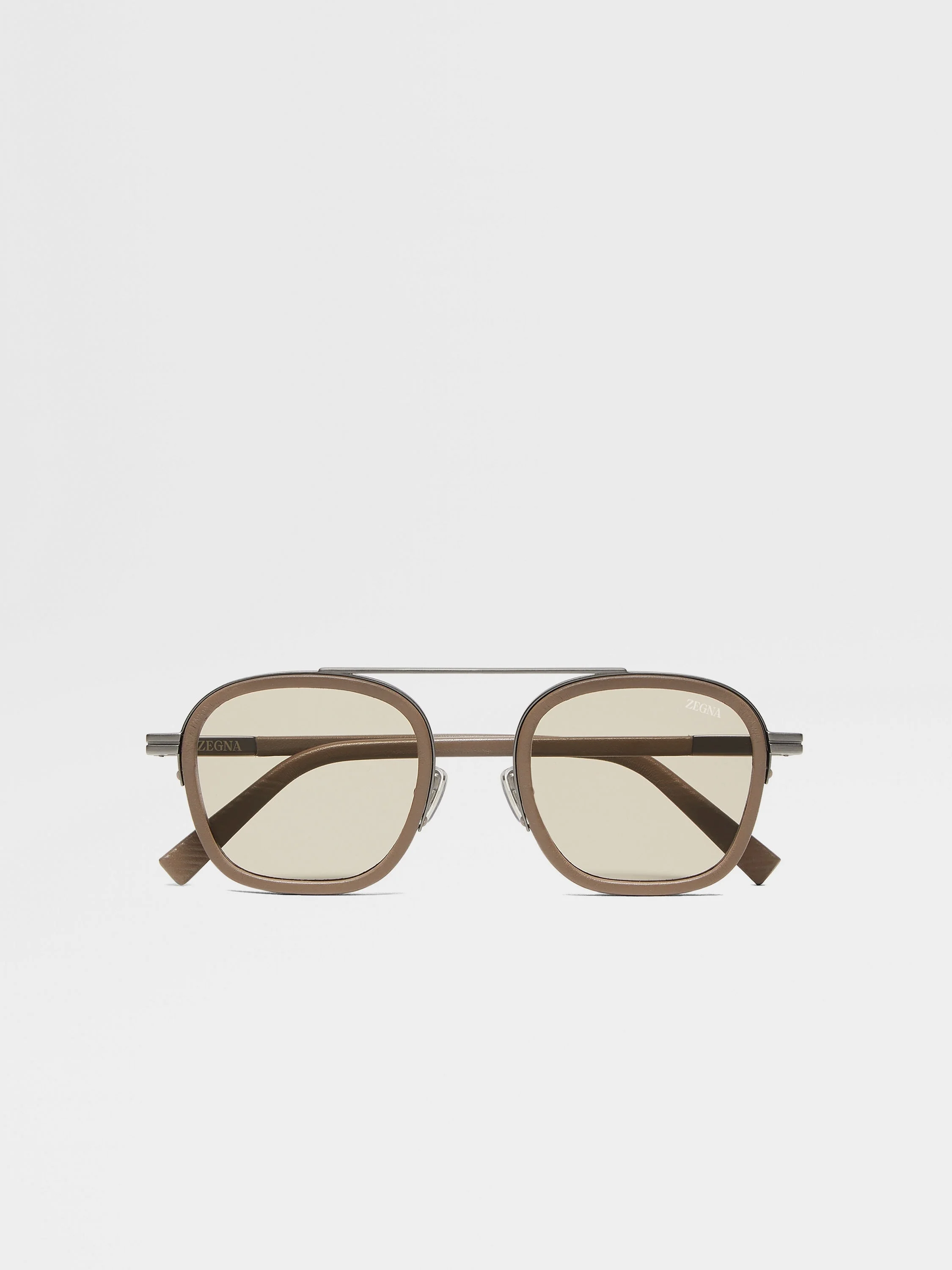 With their special construction, the dark beige Orizzonte I acetate, metal and leather sunglasses are an ultra-contemporary choice. INFO A raised bridge borrowed from classic aviators frames the dark beige Orizzonte I acetate and metal sunglasses' rounded lenses, a geometric silhouette defined by its distinctive high metal bridge construction, which inspired the name Orizzonte. The sunglasses are equipped with adjustable nose pads for a secure fit, featuring the Zegna Logo. The matte frames are embellished with chiseled lines on the temple tips and the matte aniline Zegna 232 Road Brand Mark on the corners. During the SS25 fashion show, an exclusive leather-lined variant was presented, with the front and temples elegantly wrapped in leather. ORIZZONTE (oridˈdzonte) — ITALIAN FOR 'HORIZON' The inspiration for the Orizzonte I Sunglasses was Born in Oasi Zegna — the home of our values in the Italian Alps. Shaped to a contemporary unbridged silhouette, they're accented with our iconic 232 Road Brand Mark and ZEGNA logo, then finessed with a slender brow bar that draws from the panoramic mountain-top views in a 100km² natural territory. PRODUCT CODE EZ0278-5157E MATERIALS AND CARE Metal; Acetate; Leather Clean your eyewear using a soft cloth, preferably microfiber, with water or a mild detergent. To avoid scratching the lenses, never use paper towels or clothing to clean your eyewear. Do not use household detergents or soaps to clean your eyewear; these products will damage the lenses over time. FIT AND PRODUCT DETAILS • Lens 51 mm – Bridge 22 mm – Temple 145 mm • Base 2 • Finishing: matte • Single bridge • Acetate end tips and rims • Matte medium bronze Zegna 232 Road Brand Mark on the temples as a corner detail • Laser-inscribed Zegna Logo on the temples • Adjustable nose pads with bold Zegna Logo • Chiseled lines on the temple tips