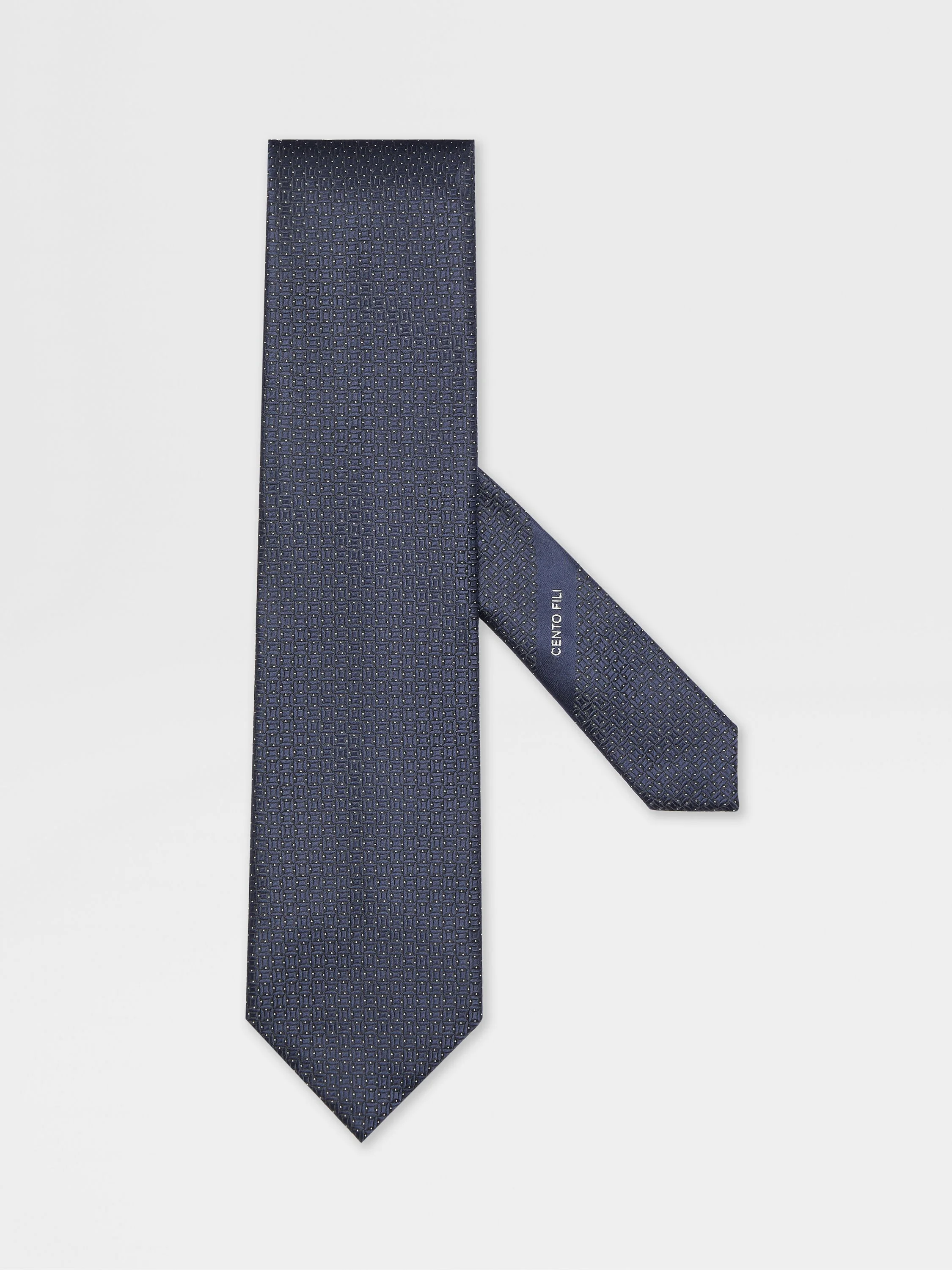 The dark blue CENTO FILI silk tie's high thread count grants it a naturally luxurious finish. INFO The dark blue CENTO FILI silk tie is embellished with a geometric jacquard pattern. Thanks to its exclusive material, this elegant accessory makes a sophisticated statement. PRODUCT CODE E8D41TA7-1PF-BL1 MATERIALS AND CARE Main body: 100% Mulberry Silk Lining: 67% Polyester; 33% Mulberry Silk Do not wash. Do not bleach. Do not tumble dry. Do not iron. Professional dry cleaning in tetrachloroethene and hydrocarbons, mild process. FIT AND PRODUCT DETAILS • Blade width: 8 cm / 3.1 in • Geometric jacquard pattern • Made in Italy