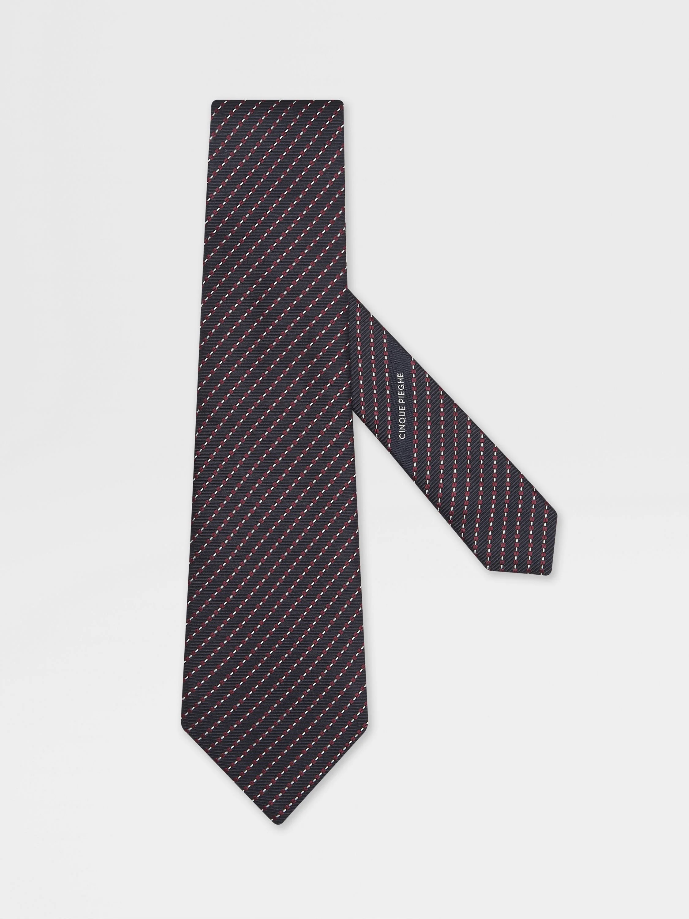 This dark blue CINQUE PIEGHE silk tie is styled with an elegant striped pattern. INFO This pure mulberry silk CINQUE PIEGHE tie is a Zegna icon, crafted with a distinctive 5-fold construction for a luxurious feel. Its dark blue striped jacquard pattern brings elegant charm to any formal ensemble. PRODUCT CODE Z9D14TA9-1P9-BL1 MATERIALS AND CARE Main body: 100% Mulberry Silk Lining: 100% Mulberry Silk Do not wash. Do not bleach. Do not tumble dry. Do not iron. Professional dry cleaning in tetrachloroethene and hydrocarbons, mild process. FIT AND PRODUCT DETAILS • Blade width: 8.8 cm / 3.4 in • Striped jacquard pattern • Made in Italy