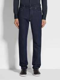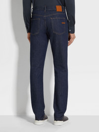 The dark blue rinse-washed cotton Roccia jeans are enhanced with a touch of elasticity. INFO Thanks to their crisp finish and comfortable fit, the dark blue rinse-washed stretch cotton Roccia jeans are perfect for elevated casual style. The slim cut elongates the legs, in line with Zegna's vision of dynamic, contemporary menswear. ROCCIA ('rɔt:ʃa) — ITALIAN FOR 'ROCK' The inspiration for the Roccia Trousers was Born in Oasi Zegna — the home of our values in the Italian Alps. Inspired by classic workwear, they're both hardwearing and elegant, making them a reliable foundation to any look. PRODUCT CODE UEL35A8-CITYE-001 MATERIALS AND CARE Main body: 99% Cotton; 1% Elastane Lining: 65% Polyester; 35% Cotton Max washing temp 30°C, mild process. Do not bleach. Do not tumble dry. Line drying in the shade. Iron at max 110°C. Do not dry clean. Wash separately. Wash inside out. FIT AND PRODUCT DETAILS • Slim fit • 17.5 cm narrow hem • Zip and button closure • 5-pocket style • Denim weight: 10.5 ounces