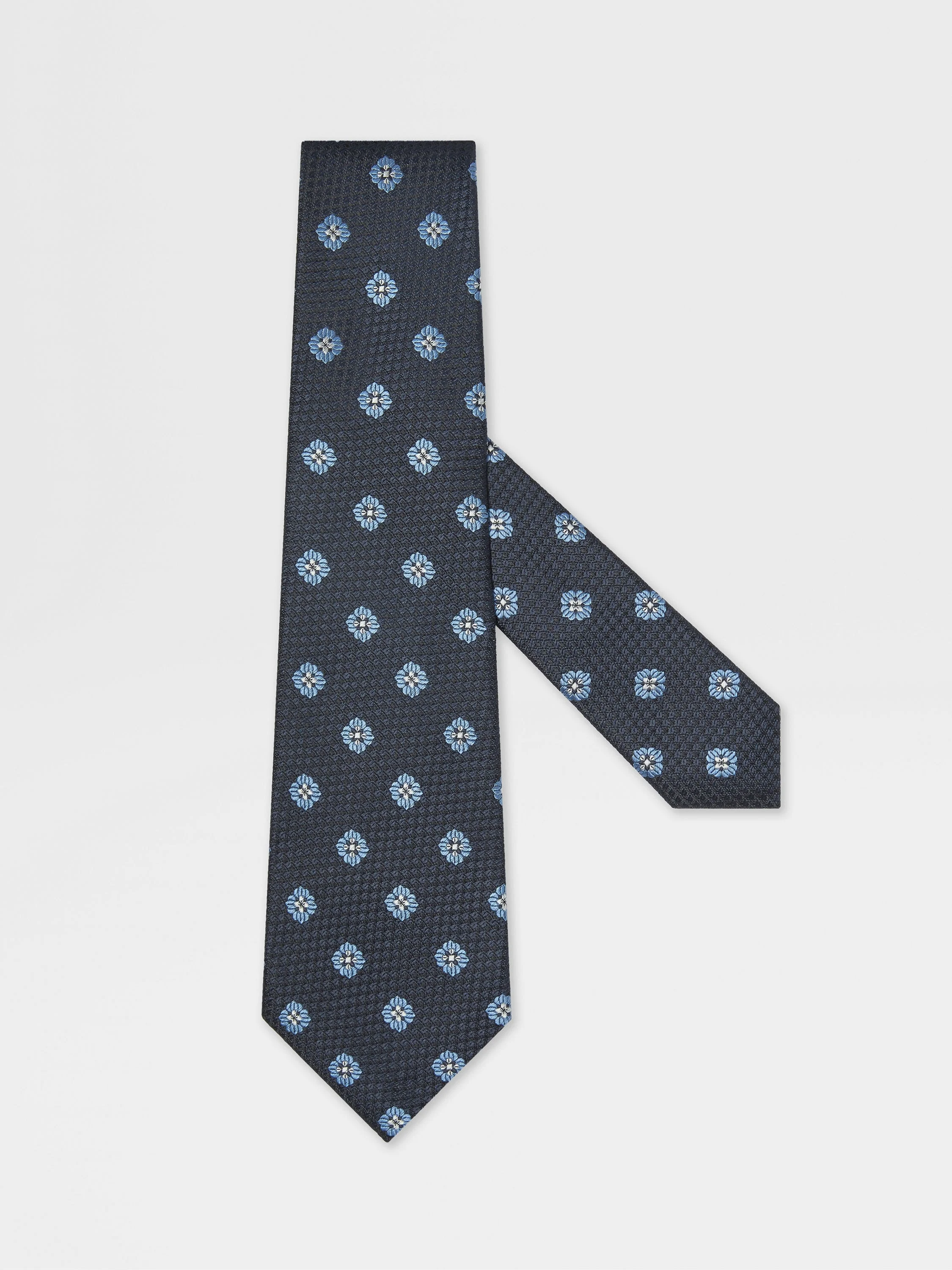 This dark blue jacquard silk tie stands out with a charming floral design. INFO The sumptuous quality of pure Mulberry silk brings depth and dimension to this dark blue jacquard tie. Designed with a floral pattern to bring fresh elegance to the most refined of looks. PRODUCT CODE Z2C82TA2-1PC-BL1 MATERIALS AND CARE Main body: 100% Mulberry Silk Lining: 100% Mulberry Silk Do not wash. Do not bleach. Do not tumble dry. Do not iron. Professional dry cleaning in tetrachloroethene and hydrocarbons, mild process. FIT AND PRODUCT DETAILS • Blade width: 8 cm / 3.1 in • Flower jacquard pattern