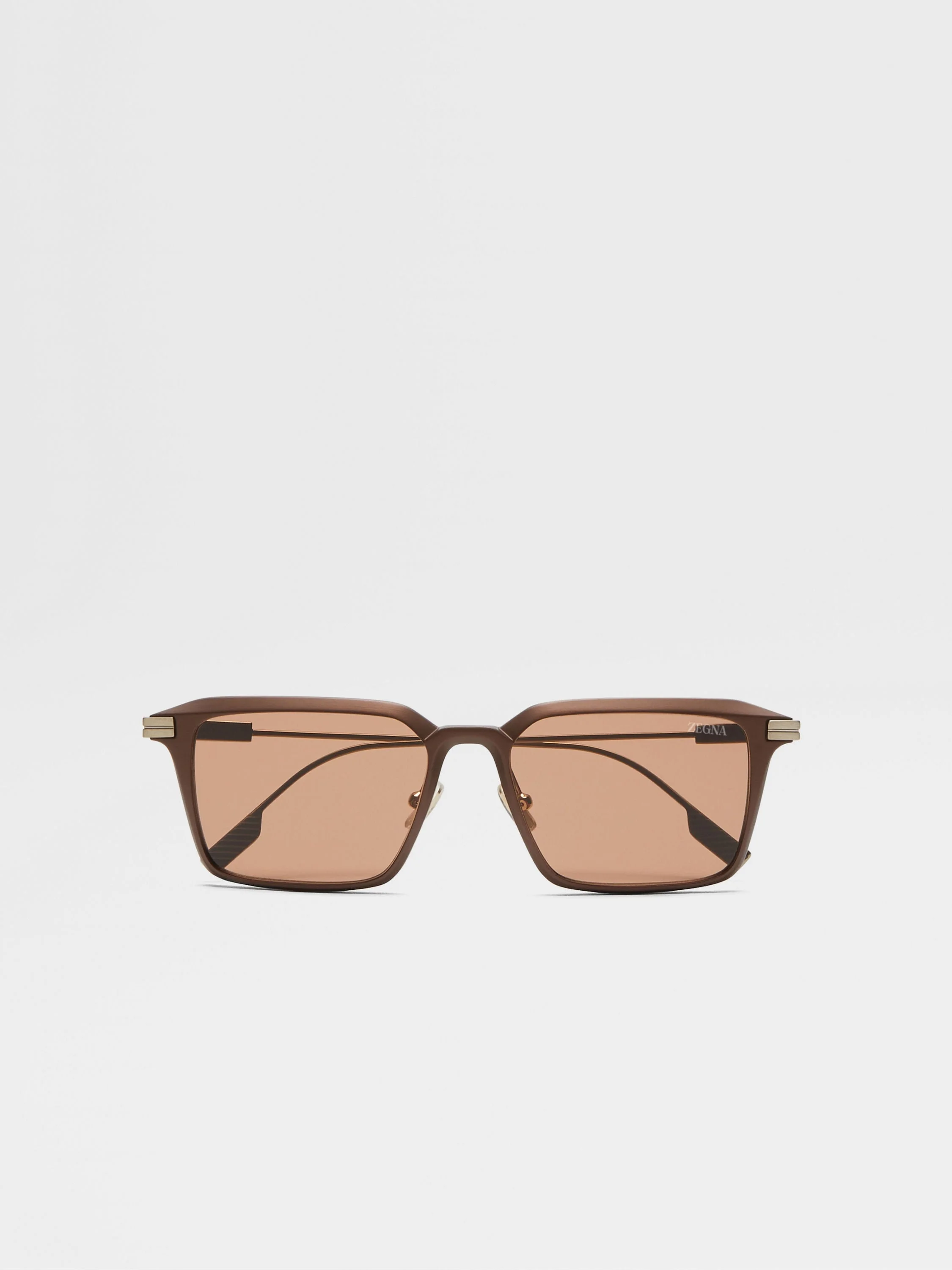 These dark brown aluminum and metal sunglasses exude contemporary charm with their narrow rectangular silhouette. INFO Crafted from ultra-flexible dark brown aluminum and metal, these sunglasses stand out with soft volumes and convex grooves for a refined three-dimensional finish, pairing a striking rectangular front with barely-there temples that float effortlessly on the face. Adjustable nose pads and grip paddles on the temple tips ensure a secure fit, whilst our iconic 232 Road Brand Mark signs off the looks with Zegna's signature elegance. PRODUCT CODE EZ0273H-5537E MATERIALS AND CARE Aluminum; Metal Clean your eyewear using a soft cloth, preferably microfiber, with water or a mild detergent. To avoid scratching the lenses, never use paper towels or clothing to clean your eyewear. Do not use household detergents or soaps to clean your eyewear; these products will damage the lenses over time. FIT AND PRODUCT DETAILS • Lens 55 mm – Bridge 17 mm – Temple 145 mm • Base 2 • Finishing: matte • Single bridge • Laser-inscribed Zegna Logo on the inside of the temple and on the lens • Zegna 232 Road Brand Mark on the temples