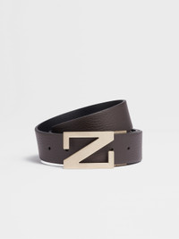 The dark brown and black reversible leather belt is a versatile choice of accessory. INFO With one side in black leather and the other in dark brown grained leather, this reversible belt makes the most of your wardrobe. Choose between two sophisticated colors and textures to complement different styles of pants. The Zegna Monogram buckle glazed in light gold adds a final flourish. PRODUCT CODE LHBOV-B027OZ-CHN MATERIALS AND CARE Grained Calfskin; Calfskin Protect from moisture and do not place near direct sources of heat. Clean with a soft cloth. Do not use solvents or polishes. Avoid contact with cosmetics, perfumes and hand lotions and sanitizers. Store in a cool, dry, well-ventilated place. Stow in the included dust bag when not in use. FIT AND PRODUCT DETAILS • Zegna Monogram buckle • Metal buckle with glazed light gold finish • Width: 3.5 cm / 1.4 in • Fully adjustable • Reversible belt • Front in dark brown grained calfskin, reverse in black calfskin • Made in Italy