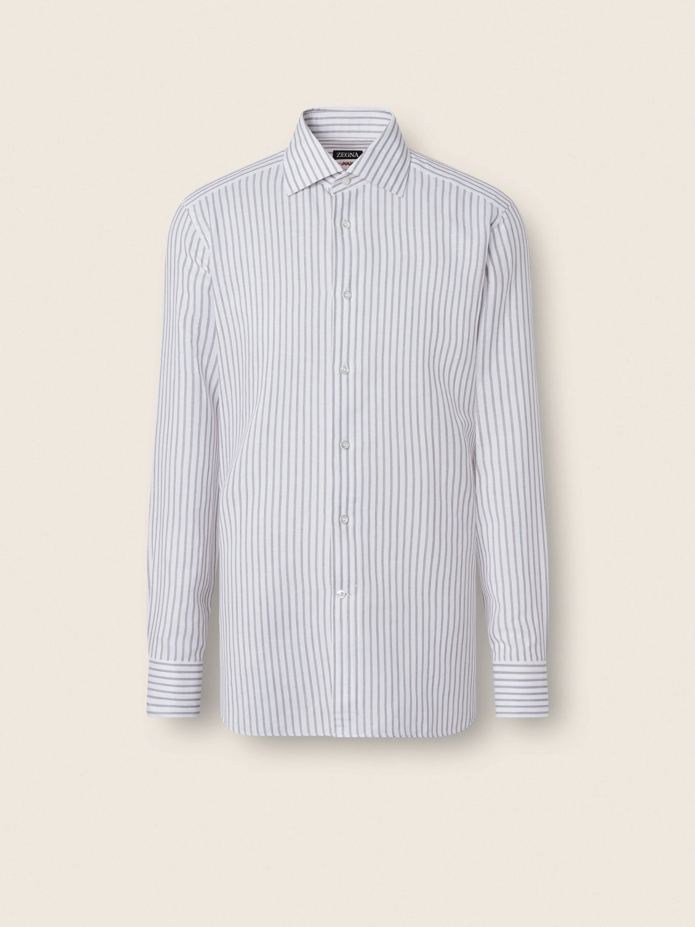 Bring impeccable style to formal occasions in this dark brown and white striped cotton-linen-silk shirt. INFO A blend of cotton, linen and silk fibers gives this regular-fit shirt a sublime drape and an exceptionally soft feel. Featuring a charming dark brown and white striped pattern, it's styled with a versatile semi-spread collar and standard cuffs. PRODUCT CODE 302335A3-9NS0AT MATERIALS AND CARE 43% Cotton; 39% Linen; 18% Mulberry Silk Max washing temp 30°C, mild process. Do not bleach. Do not tumble dry. Flat drying. Iron at max 110°C. Do not dry clean. FIT AND PRODUCT DETAILS • Regular fit • Tailoring shirt • Semi-spread collar • Rounded hem • Standard cuffs • Button closure • Striped pattern • Light-weight fusing • 79 cm length on size 39