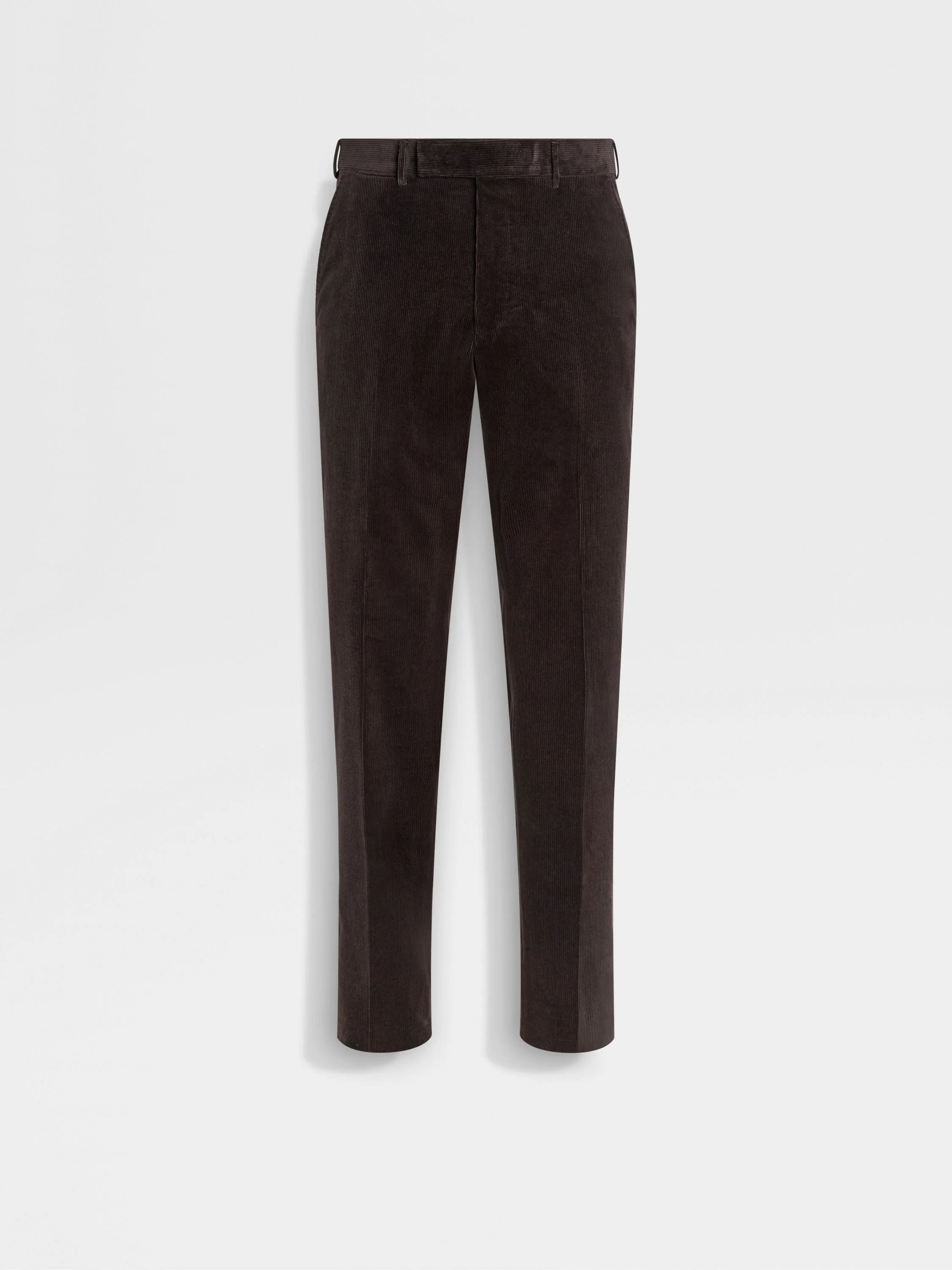These dark brown Cashco corduroy pants elevate a sartorial silhouette in ZEGNA's luxurious blend of cotton and cashmere. INFO Crafted from ZEGNA's signature blend of cashmere and cotton, these dark brown Cashco corduroy pants are soft and breathable with a beautifully tactile ribbed finish. Their contemporary slim fit is styled with a flat front and welt pockets. PRODUCT CODE 270F33A2-75TB12 MATERIALS AND CARE 91% Cotton; 8% Cashmere; 1% Elastane This garment is crafted from a luxurious blend of cashmere and cotton for exceptional softness and breathability. Do not wash. Do not bleach. Do not tumble dry. Iron at max 110°C. Professional dry cleaning in hydrocarbons, mild process. FIT AND PRODUCT DETAILS • Slim fit • Tailoring pants • 18.5 cm hem • Button and zip closure • Welt pockets • Flat front style • Unlined • Corduroy