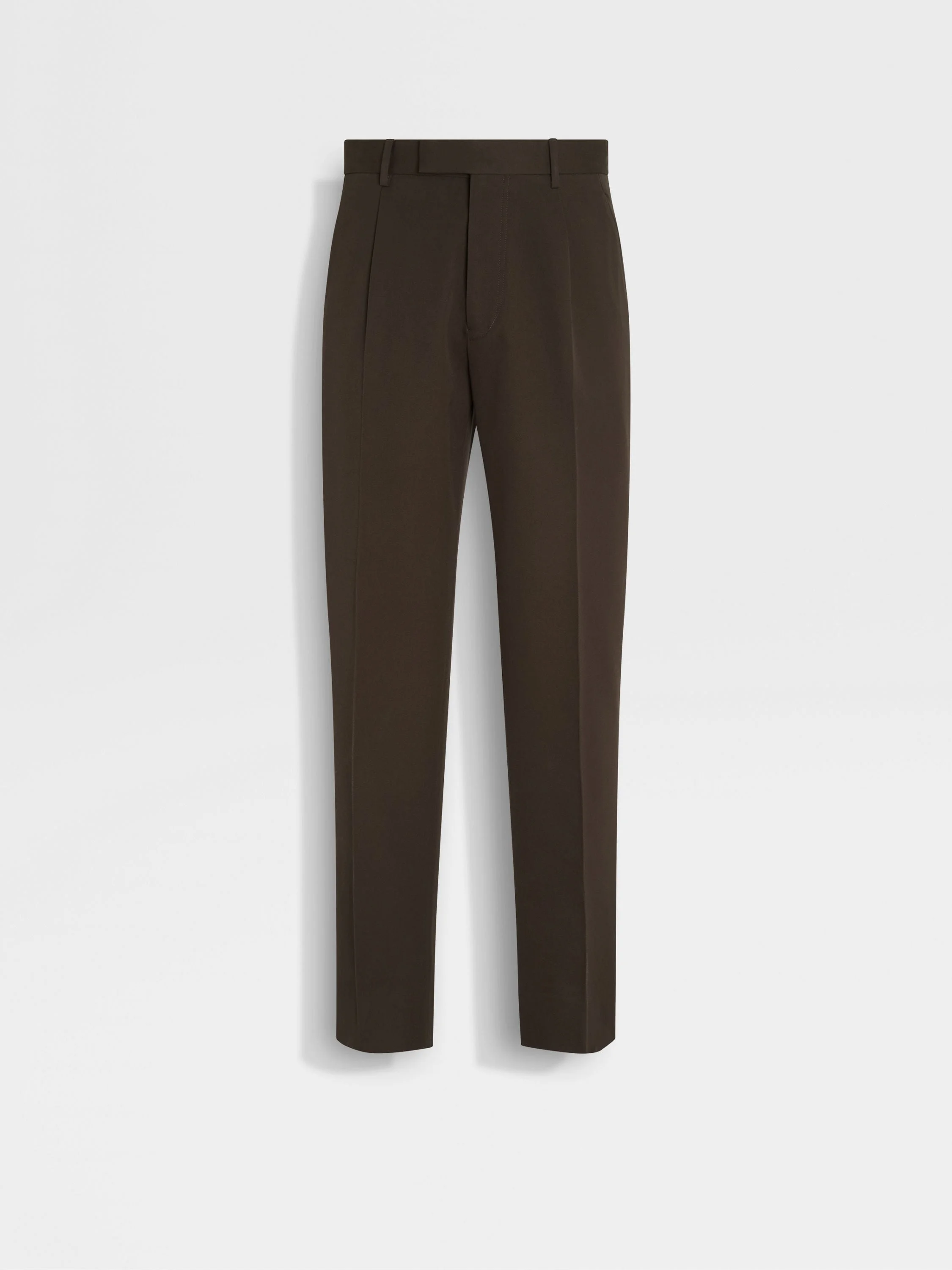 With their single pleats, these dark brown cotton-wool pants are the definition of classic elegance. INFO Embrace ZEGNA's vision of luxury leisurewear in these dark brown pants, crafted from a refined blend of cotton and wool. Single pleats elevate their sophisticated silhouette with depth and volume. PRODUCT CODE UGI04A2-TP45-M09 MATERIALS AND CARE Main body: 57% Cotton; 43% Wool Lining: 100% Cotton Do not wash. Do not bleach. Do not tumble dry. Iron at max 110°C. Professional dry cleaning in hydrocarbons, mild process. Wash inside out. FIT AND PRODUCT DETAILS • Pleated fit • 19.5 cm open hem • Button, hook and zip closure • Slanted pockets and back welt pockets • One pleat front style