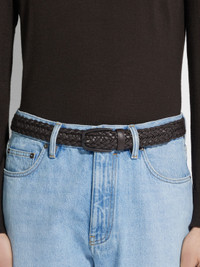 The dark brown leather belt revisits a classic accessory with contemporary finishes. INFO A sophisticated, braided construction highlights the dark brown leather belt's supple material. The fine lamb leather is set off with a metal belt buckle featuring a black, brushed PVD finish for an ultra modern twist. PRODUCT CODE LHIMP-B021ZZ-TDM MATERIALS AND CARE Lamb Leather Protect from moisture and do not place near direct sources of heat. Clean with a soft cloth. Do not use solvents or polishes. Avoid contact with cosmetics, perfumes and hand lotions and sanitizers. Store in a cool, dry, well-ventilated place. Stow in the included dust bag when not in use. FIT AND PRODUCT DETAILS • Braided lamb leather • Metal buckle with black brushed PVD finish • Fixed belt • Made in Italy • Width: 3.2 cm / 1.2 in
