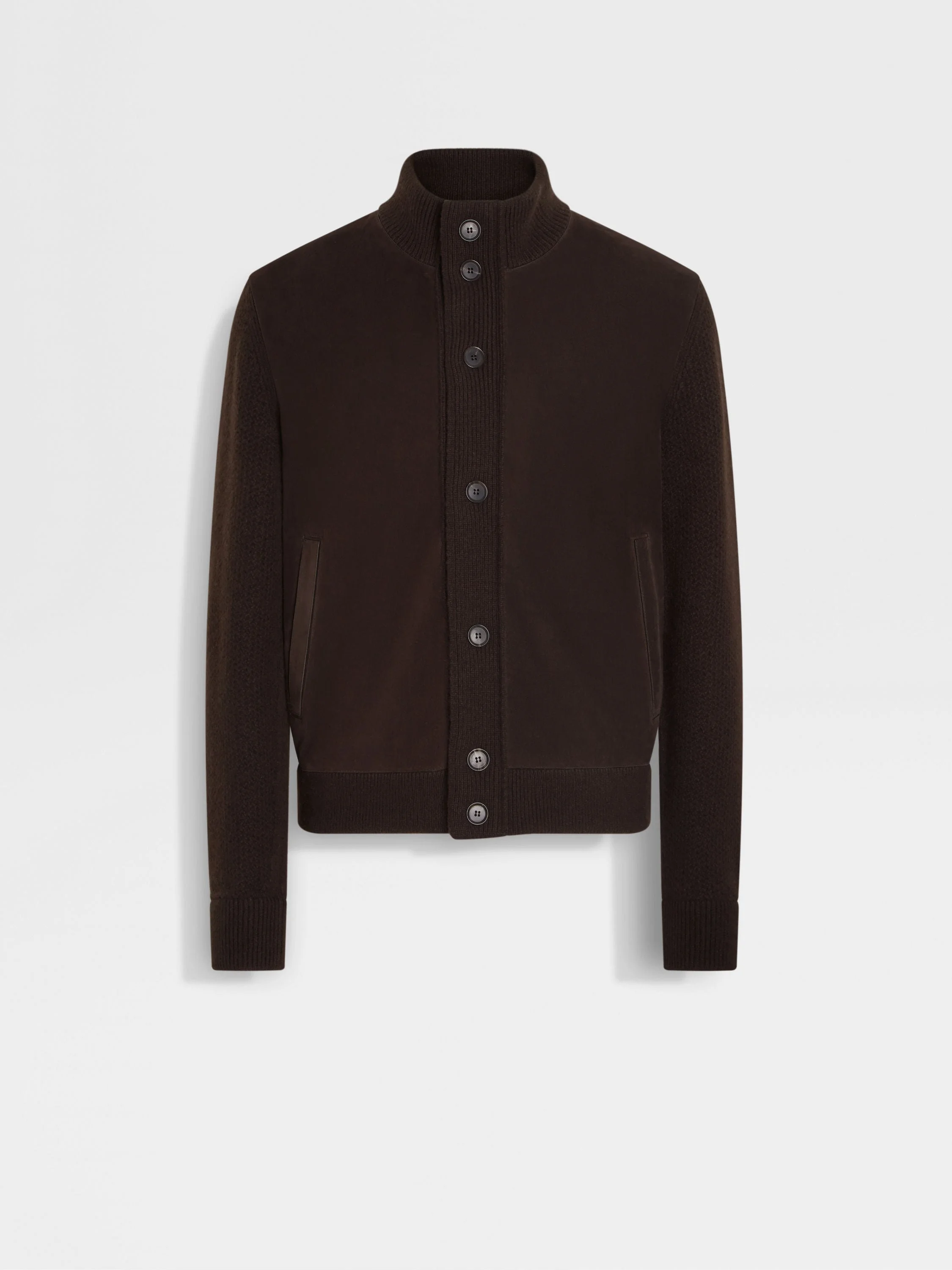 Embrace sporty elegance in this dark brown blouson, made from ZEGNA's exclusive Oasi Cashmere. INFO This dark brown blouson reimagines a sporty silhouette with a tactile waffle stitch, knit from Oasi Cashmere: one of ZEGNA's softest, most exclusive fibers. A suede panel on the front creates a sophisticated interplay of textures. PRODUCT CODE UGK8PA2-157-M98 MATERIALS AND CARE Main body: 100% Cashmere Leather details: Calfskin The inspiration behind this Oasi Cashmere collection garment was born in Oasi Zegna, a 100km² natural territory and the home of our values. It's crafted from Oasi Cashmere fibres, made with 100% certified traceable fibres. The Oasi Cashmere collection follows in the footsteps of our Founder, who envisioned a vertically integrated system of producing textiles. Do not wash. Do not bleach. Do not tumble dry. Iron at max 110°C. Professional dry cleaning in hydrocarbons, mild process. Professional leather clean only. Wash and iron inside out. FIT AND PRODUCT DETAILS • Waffle stitch • 8 gauge • Ribbed stand collar • Long sleeves • Ribbed hem and cuffs • Button closure • Stand lower pockets • Suede front panel