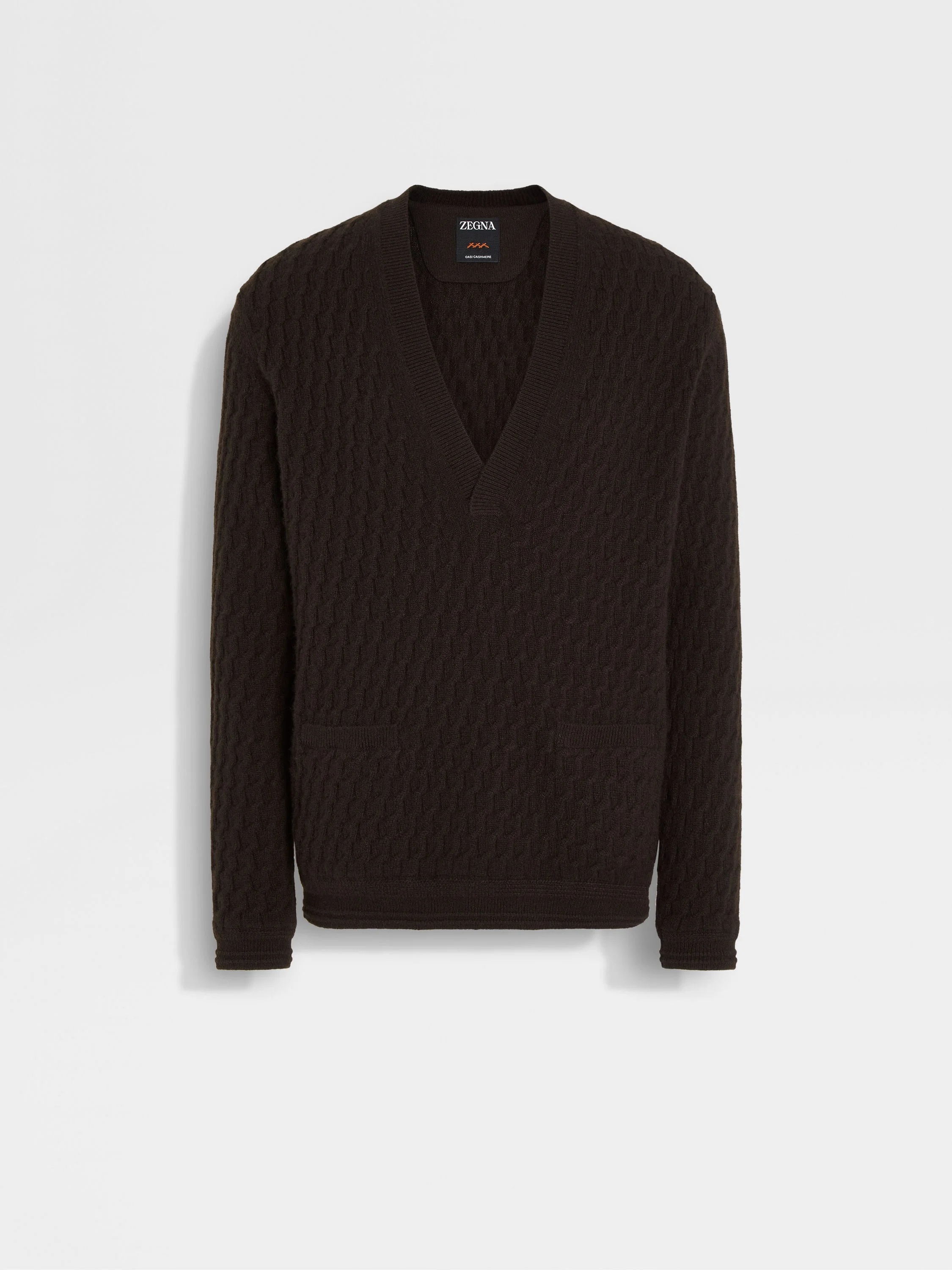Choose effortless elegance in this dark brown V-neck, made from ZEGNA's exclusive Oasi Cashmere. INFO First seen in the ZEGNA Fashion Show, this dark brown cable-knit V-neck is knit from luxurious Oasi Cashmere: meticulously selected fibers that honor ZEGNA's commitment to traceability. Welt pockets add a smart edge. PRODUCT CODE UGSK71A2-VNS-M09 MATERIALS AND CARE 100% Cashmere The inspiration behind this Oasi Cashmere collection garment was born in Oasi Zegna, a 100km² natural territory and the home of our values. It's crafted from Oasi Cashmere fibres, made with 100% certified traceable fibres. The Oasi Cashmere collection follows in the footsteps of our Founder, who envisioned a vertically integrated system of producing textiles. Wash by hand. Do not bleach. Do not tumble dry. Flat drying. Iron at 110°C. Professional dry cleaning in hydrocarbons, mild process. Wash and iron inside out. FIT AND PRODUCT DETAILS • Regular fit • Ribbed V-neck collar • 7 gauge • Ribbed hem and cuffs • Welt pockets • Cable stitch