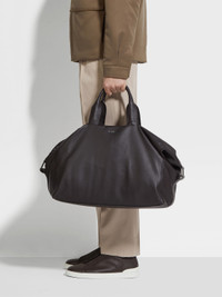 The dark brown SECONDSKIN holdall Raglan is made from super supple calf leather. INFO The dark brown SECONDSKIN holdall Raglan's roomy design is perfect for travel. Its flexible exterior adapts to any situation and complements the bag's soft, versatile shape. Polished ultrablack finishes and the Zegna Logo add a final accent. PRODUCT CODE LHOTO-C2201Z-AMO MATERIALS AND CARE Main body: Calf Leather Lining: 100% Cotton SECONDSKIN is crafted by tanneries selected for their renowned expertise. Fine, supple and incredibly soft to the touch, it moulds to your proportions over time — offering impeccable comfort with each wear. Protect from moisture and do not place near direct sources of heat. Clean with a soft cloth. Do not use solvents or polishes. Avoid contact with cosmetics, perfumes and hand lotions and sanitizers. Store in a cool, dry, well-ventilated place. Stow in the included dust bag when not in use. FIT AND PRODUCT DETAILS • Zip closure • Polished ultrablack finish • Zegna Logo • Grey melange cotton lining • 44 x 30 x 17 cm / 17.3 x 11.8 x 6.6 in • Made in Italy