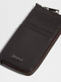 Embrace the sleek elegance of dark brown leather with this SECONDSKIN wallet. INFO The refined allure of genuine leather takes center stage with this dark brown SECONDSKIN wallet, elevated with polished ultrablack hardware and a sleek Zegna Logo. Styled with a secure zip closure and a durable polyester lining. PRODUCT CODE LHOTO-E1958Z-AMO MATERIALS AND CARE Main body: Calf Leather Lining: 100% Polyester SECONDSKIN is crafted by tanneries selected for their renowned expertise. Fine, supple and incredibly soft to the touch, it moulds to your proportions over time — offering impeccable comfort with each wear. Protect from moisture and do not place near direct sources of heat. Clean with a soft cloth. Do not use solvents or polishes. Avoid contact with cosmetics, perfumes and hand lotions and sanitizers. Store in a cool, dry, well-ventilated place. Stow in the included dust bag when not in use. FIT AND PRODUCT DETAILS • Zip closure • Zegna Logo • 10 card slots • Polished ultrablack finish • Dark grey polyester lining • 11 x 7.5 cm / 4.3 x 2.9 in • Made in Italy