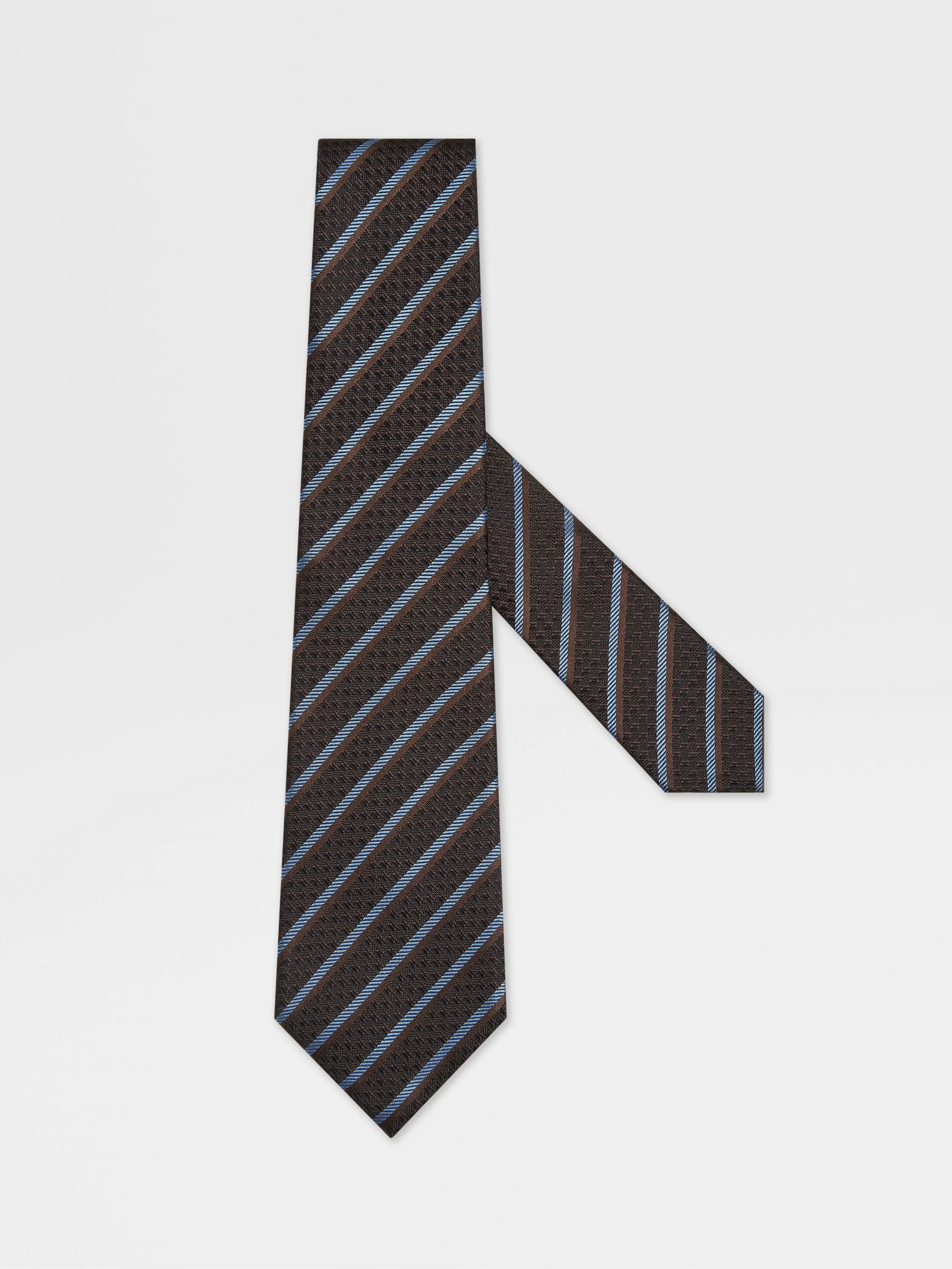 Pure silk and timeless stripes: elevate your office-to-evening ensembles with this dark brown jacquard tie. INFO Pure Mulberry silk in a dark brown hue provides a sumptuous backdrop for an elegant striped pattern with this jacquard tie. A refined essential for all kinds of formal occasions. PRODUCT CODE Z2C83TA2-1PC-BR1 MATERIALS AND CARE Main body: 100% Mulberry Silk Lining: 100% Mulberry Silk Do not wash. Do not bleach. Do not tumble dry. Do not iron. Professional dry cleaning in tetrachloroethene and hydrocarbons, mild process. FIT AND PRODUCT DETAILS • Blade width: 8 cm / 3.1 in • Striped jacquard pattern