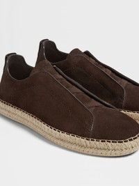 The dark brown suede Triple Stitch™ espadrilles elevate casual footwear. INFO A lighter version of Zegna's iconic sneakers, the dark brown suede Triple Stitch™ espadrilles combine an unexpected mix of materials to create a chic look. Underneath the rich suede, the espadrilles' iconic roped midsoles are paired with lightweight rubber soles. Their signature triple-crossed elastics keep them secure while evoking the traditional hand-stitching of tailored jackets, a tribute to the brand's legacy. Customize these sneakers with our Made to Measure Service. For more information, please contact our Customer Care or visit your nearest stores. PRODUCT CODE LHCSR-S5970Z-TDM MATERIALS AND CARE Suede Protect from moisture and do not place near direct sources of heat. Clean with a brush designed for use with suede. Avoid contact with cosmetics, perfumes and hand lotions and sanitizers. Store in a cool, dry, well-ventilated place. Stow in the included dust bag when not in use. FIT AND PRODUCT DETAILS • Reversed suede • Crossing elastics • Stitched jute rope around midsole • Rubber sole • Sanitized® removable footbed • Made in Italy • Comes with a shoe bag We want every pair of Triple Stitch™ sneakers to fit perfectly anytime, anywhere, anyplace. To find your perfect fit, we recommend going down a half-size compared to your usual shoe size. Please note that Zegna uses UK sizing. For further information, please contact us via our customer service channels or by visiting the nearest Zegna flagship store.