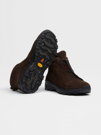 Slip on the dark brown suede Triple Stitch™ Vetta high top sneakers to create high-impact looks. INFO Inspired by the trails of Oasi Zegna, the dark brown suede Triple Stitch™ Vetta shoes hybridise hiking and sporting styles. An evolution of the iconic Triple Stitch™ Luxury Leisurewear shoes, they're hallmarked with a trio of crosses that are inspired by the handmade stitches found on our jackets, then set on a Vibram® Arctic Grip™ sole — providing increased traction for outdoor pursuits. PRODUCT CODE LHNVB-S5809Z-TDM MATERIALS AND CARE Suede Clean with a soft cloth. Avoid contact with abrasives, water and substances containing alcohol, such as perfumes, solvents, etc. In case of contact with water, it is important to let the footwear dry completely before cleaning. Clean the rubber soles with a product specifically designed for cleaning rubber. Store in the included dust bag in a cool, dry place. FIT AND PRODUCT DETAILS • Crossing elastics • Adjustable drawstring at the ankle • Leather lining • Sanitized® insole • Black Vibram® Arctic Grip™ sole • Tonal Zegna 232 Road Brand Mark on the heel tab • Made in Italy • Comes with a shoe bag We want every pair of Triple Stitch™ sneakers to fit perfectly anytime, anywhere, anyplace. To find your perfect fit, we recommend going down a half-size compared to your usual shoe size. Please note that Zegna uses UK sizing. For further information, please contact us via our customer service channels or by visiting the nearest Zegna flagship store.