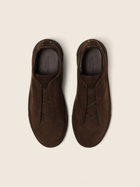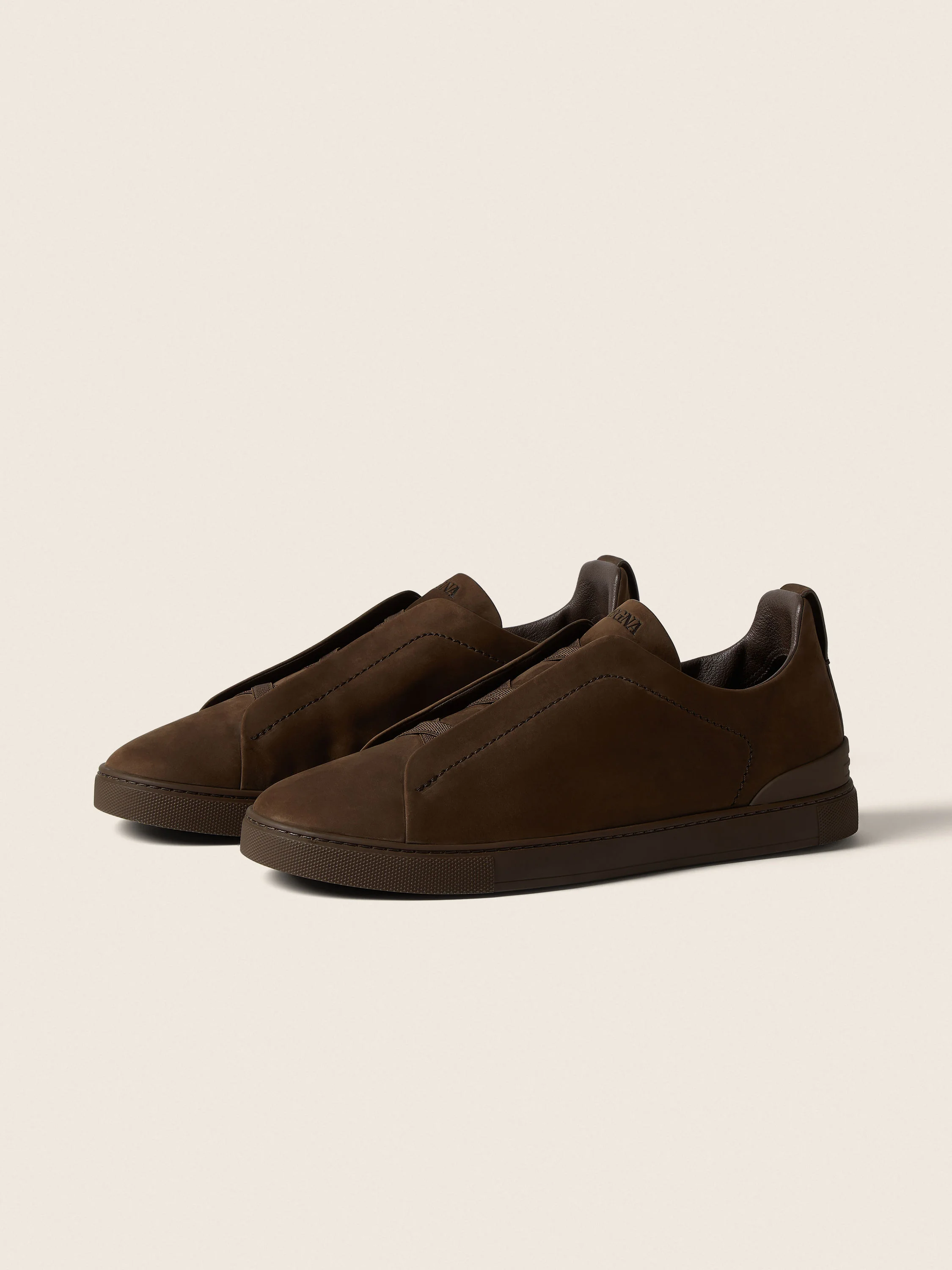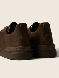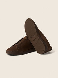 These dark brown Triple Stitch™ SECONDSKIN nubuck sneakers mold perfectly to your every stride. INFO These Triple Stitch™ SECONDSKIN sneakers are crafted from ZEGNA’s exclusive nubuck for a glove-like fit. Presented in dark brown with a tonal rubber sole, they feature our hallmark style's characteristic crossed elastics that evoke the traditional hand-stitching of tailored jackets in homage to the Brand's legacy of fine craftsmanship. The ZEGNA 232 Road Brand Mark on the heel tab signs off the design. The Triple Stitch™ SECONDSKIN shoes are the result of more than a century of generational craftsmanship, the sharing of wisdom, and dedication to innovation. Crafted from our SECONDSKIN leather, this shoe is for those who appreciate exceptional and contemporary style. The Triple Stitch™ SECONDSKIN nubuck has a soft, supple feel with a velvet-like finish for textural difference. PRODUCT CODE LHNBC-S7964Z-DMT MATERIALS AND CARE Nubuck SECONDSKIN is crafted by tanneries selected for their renowned expertise. Fine, supple and incredibly soft to the touch, it offers impeccable comfort with each wear. Clean the shoes with a soft bristle brush. Avoid contact with water and substances containing alcohol (perfumes, solvents, etc.) and, in general, any abrasive products. In the event of contact with water, it is important to allow the shoes to dry completely before cleaning. Clean the rubber sole with a product specially designed for cleaning rubber. Store the shoes in a cool, dry place in the fabric bags provided at the time of purchase. To preserve the quality of your Triple Stitch™ SECONDSKIN, we recommend using our exclusive Care Kit. FIT AND PRODUCT DETAILS • Crossed elastics • SECONDSKIN nubuck • Tonal rubber sole • Strobel construction • ZEGNA 232 Road Brand Mark on the heel tab • Sanitized® removable footbed • Made in Italy • Comes with a shoe bag We want every pair of Triple Stitch™ sneakers to fit perfectly anytime, anywhere, anyplace. To find your perfect fit, we recommend going down a half-size compared to your usual shoe size. Please note that ZEGNA uses UK sizing. For further information, please contact us via our customer service channels or by visiting the nearest ZEGNA flagship store.