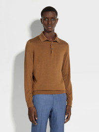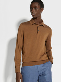 The dark Foliage Cashseta polo shirt is made from a soft and lightweight blend of natural fibers. INFO An elevated addition to any casual wardrobe, Zegna's refined blend of cashmere and silk lends the dark Foliage Cashseta polo shirt its distinctive finish. The long-sleeved polo is finished off with the classic ribbed collar and cuffs. PRODUCT CODE E8J00-132-N95 MATERIALS AND CARE 70% Cashmere; 30% Mulberry Silk This sophisticated fabric combines the softness of cashmere with the smooth finish of fine silk. The yarns of Cashseta are dyed before the fabric is created, resulting in a mélange that is unique to each garment. Do not wash. Do not bleach. Do not tumble dry. Iron at max 110°C. Professional dry cleaning in hydrocarbons. Wash inside out. FIT AND PRODUCT DETAILS • 18 gauge • Ribbed polo collar • Long sleeves • Ribbed hem and cuffs • Button closure • Regular fit • Model is 187 cm tall (6.1 feet) and wears an Italian size 48.